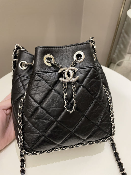 Chanel Cc Drawstring Bucket Chain Bag Black Aged Calfskin