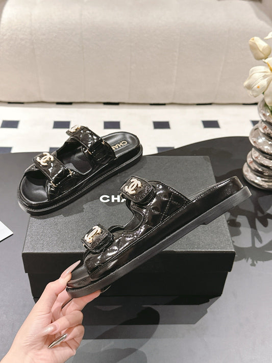 CHANEL 25 Dad Sandal Mules Black Patent Leather 237585