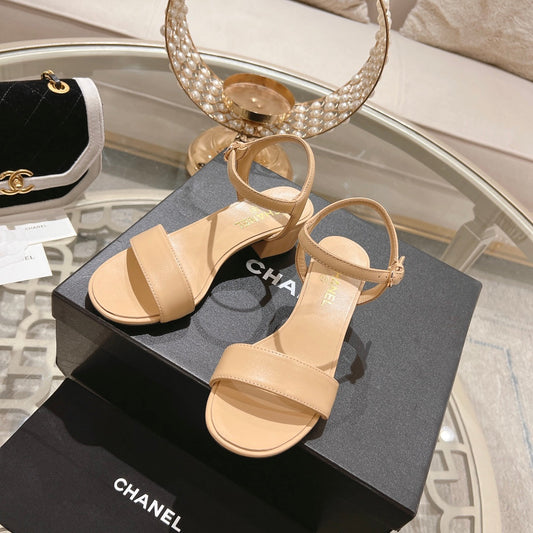 CHANEL 25C 5CM Mid Heed Sandals Cream Italian Leather 213317