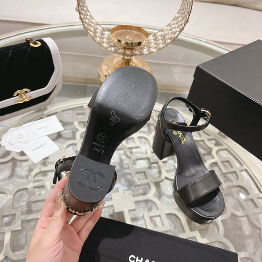 CHANEL 25C 10CM Mid Heed Sandals Black Italian Leather 213318