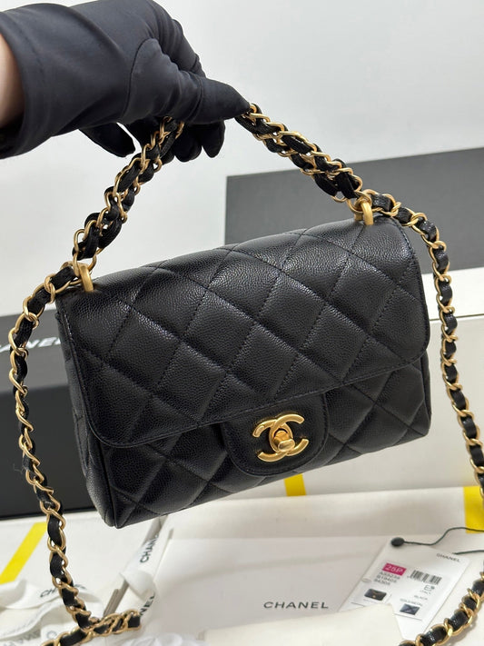CHANEL 25P Medium Flap Bag 25cm Top Handle Black Calfskin Gold Hardware