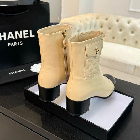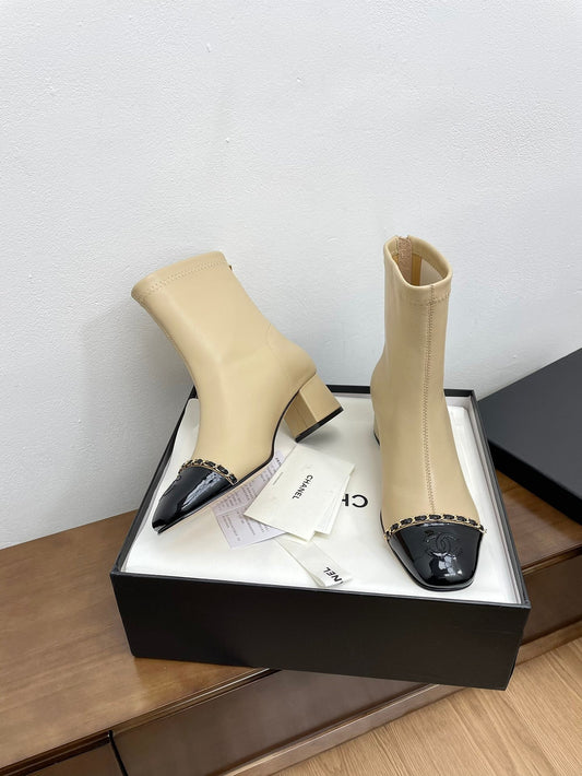 CHANEL Ankle Boots 50mm Beige Black Lambskin