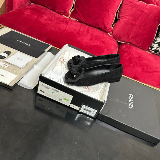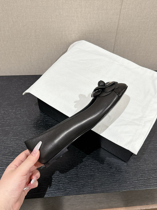 CHANEL ballet flat flower beige calfskin black patent calfskin