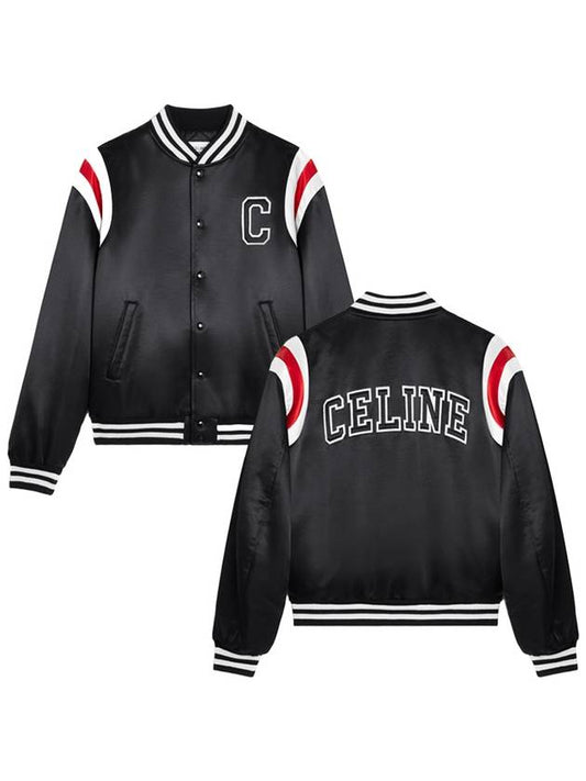 CELINE Men's Logo Patch Satin Bomber Jacket Black