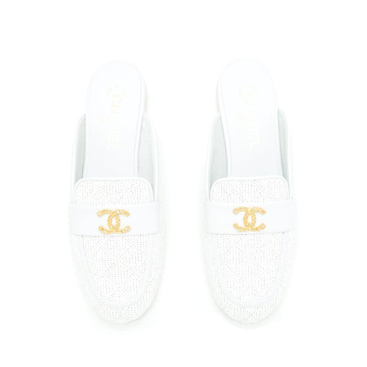 Chanel Size 38 CC Logo Sequins Lambskin Mule White GHW