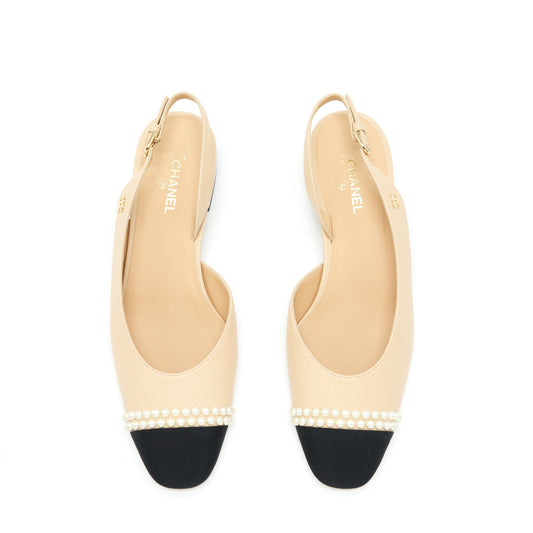 Chanel 38.5C Slingback Flats Beige With Pearls