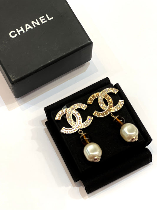 CHANEL COCO CHANEL Logo Gold Tone Disc Pearl Drop Earrings