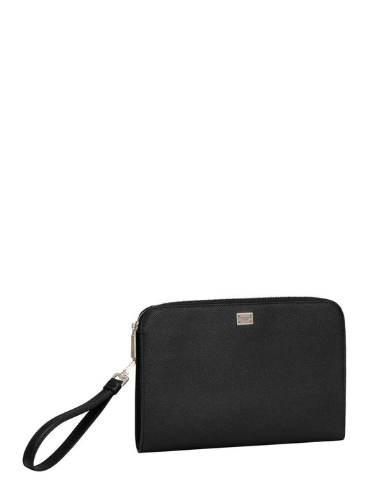 Dolce & Gabbana Men Black Clutch With Removable Wrist Strap And Logo Plaque On The Front In Grained Leather Man