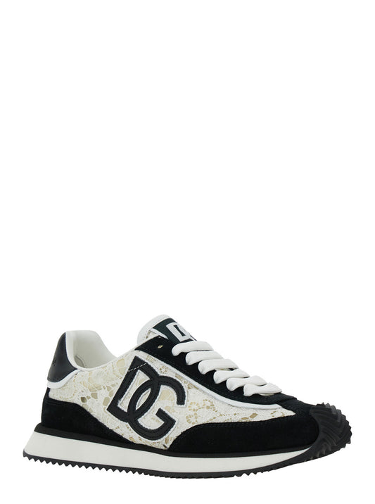 Dolce & Gabbana Women Black And White Low Top With Lace Details And Dg Patch On The Side In Fabric And Suede Blend Woman