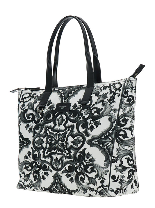 Dolce & Gabbana Men Black Tote Bag With Top Zip Closure And All-Over Print In Tech Fabric Man