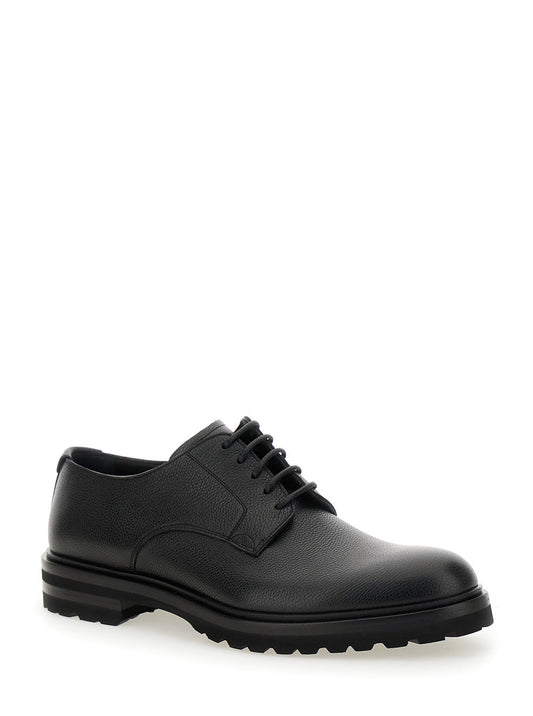 Dolce & Gabbana Men 'Altavilla' Black Derby Lace-Up Shoes With Metal Dg Logo On Heel In Brushed Leather Man
