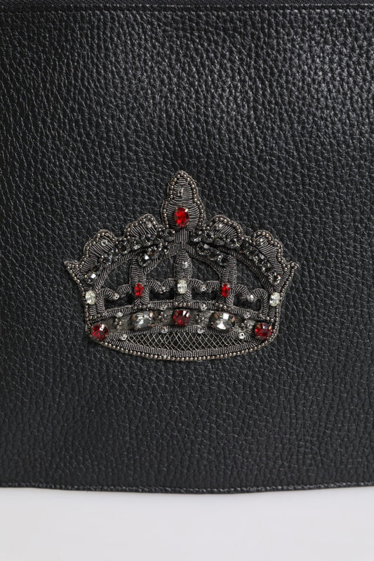 Dolce & Gabbana Black Calfskin Crown Embellished Clutch Pouch Men's Bag