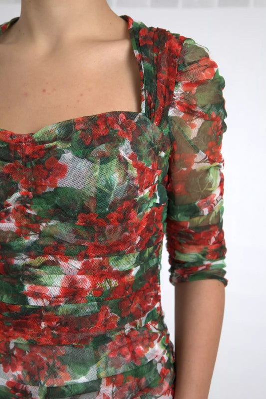Dolce & Gabbana Red Floral Print Tulle Sheath Midi Women's Dress ()