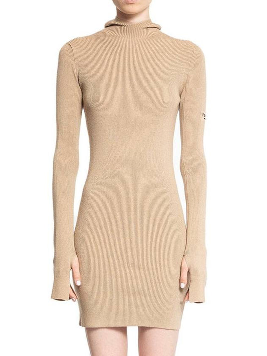 Fendi Long Sleeve Hooded Wool Silk Short Dress Beige