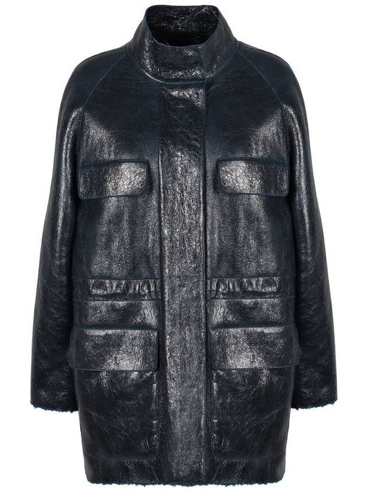 Fendi High Neck Leather Jacket Dark Blue