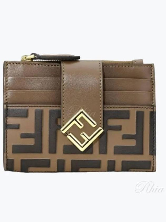 Fendi FF Diamond Embossed Logo Zip Card Holder Brown