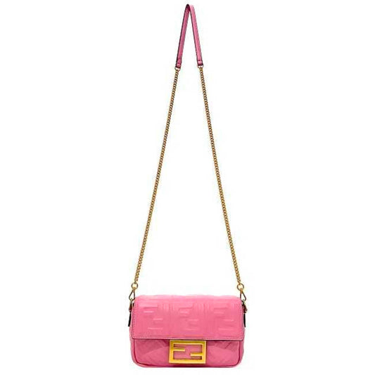 FENDI Baguette Small Pink Gold 8BS017 Leather GP Shoulder Bag FF Embossed Ladies Chain
