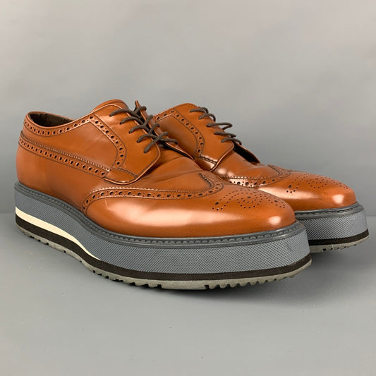 PRADA Size 10.5 Tan Orange Leather Perforated Wingtip Laces
