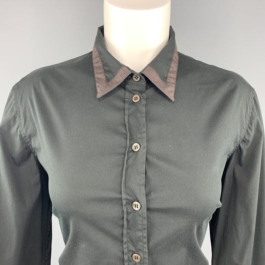 PRADA Size 10 Black Stretch Cotton Brown Trim Blouse