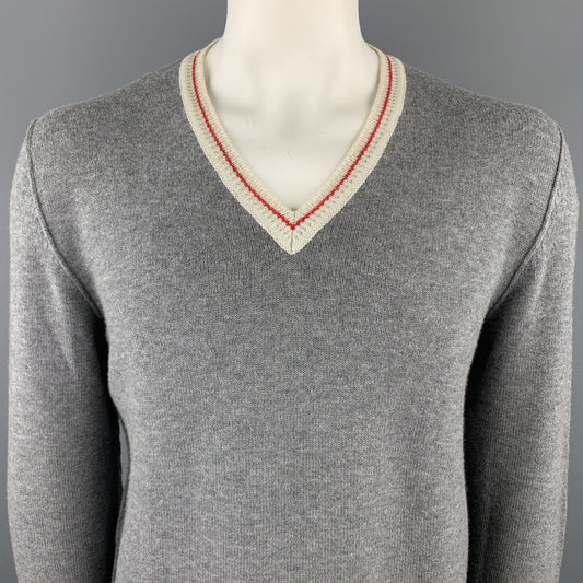 PRADA Size L Gray Wool V-Neck Beige Trim Elbow Patch Pullover Sweater
