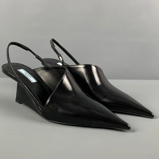PRADA Size 7.5 Black Leather Slingback Wedge Pumps