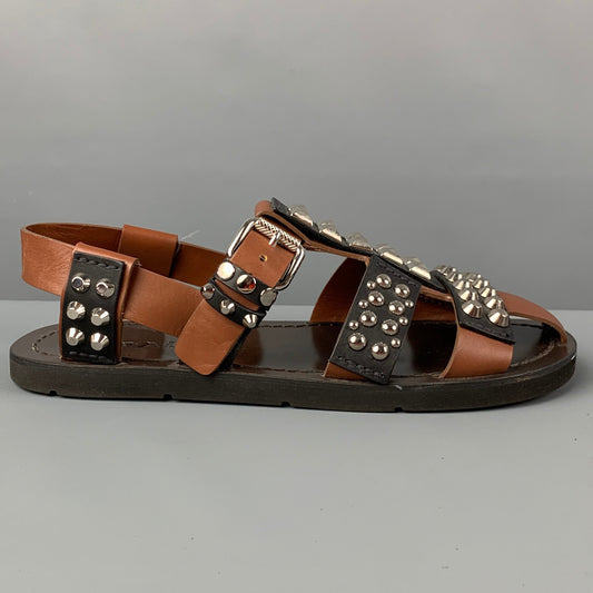 PRADA SS 18 Size 11 Black Brown Studded Leather Straps Sandals