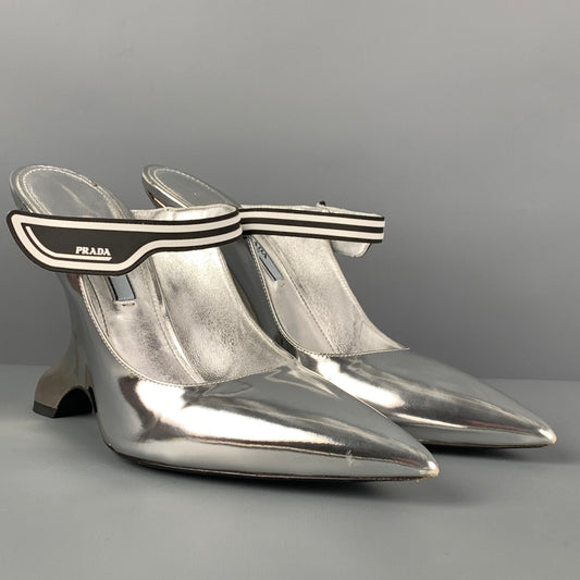PRADA Size 7.5 Silver Patent Leather Mules Pumps