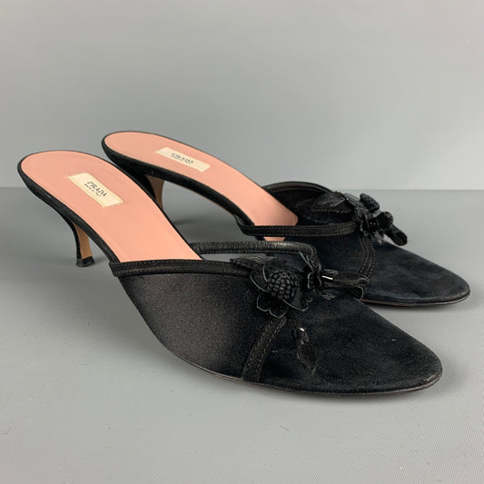 PRADA Size 8 Black Silk Aplique Patent Leather Kitten Heel Sandals
