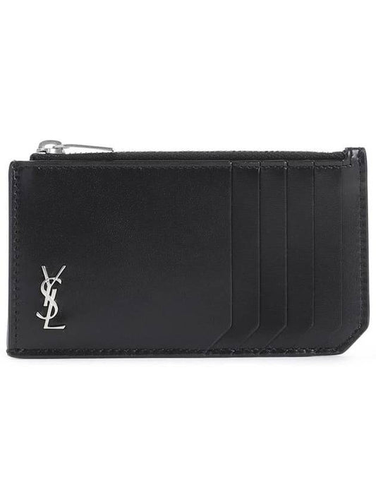 Saint Laurent Tiny Cassandre Fragments Silver Hardware Leather Zipper Card Wallet Black