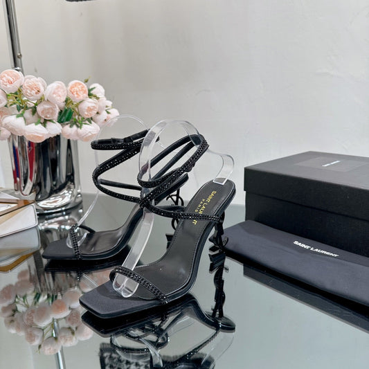 Saint Laurent SL OPYUM WHITE CRYSTAL HEELED SANDALS BLACK SATIN