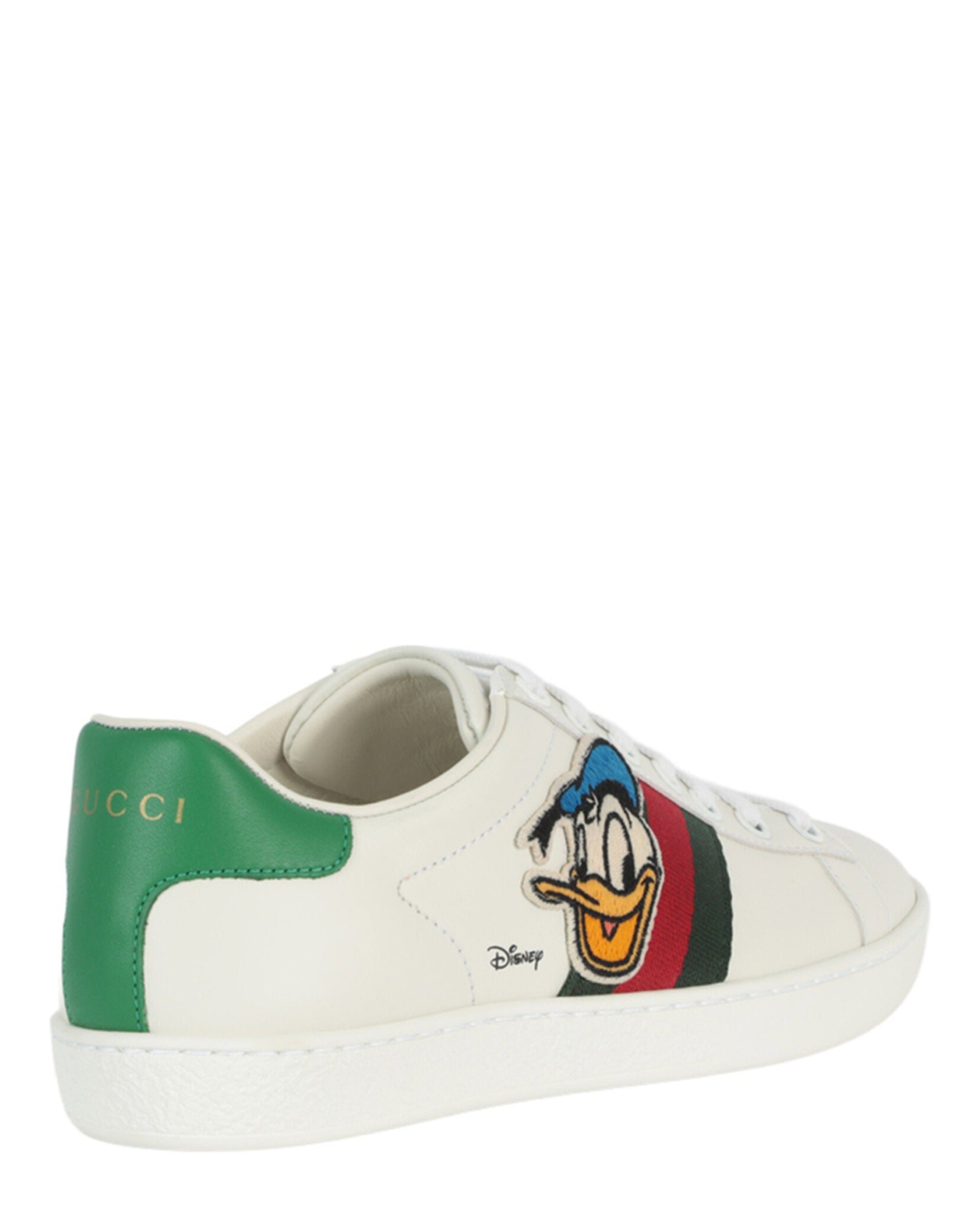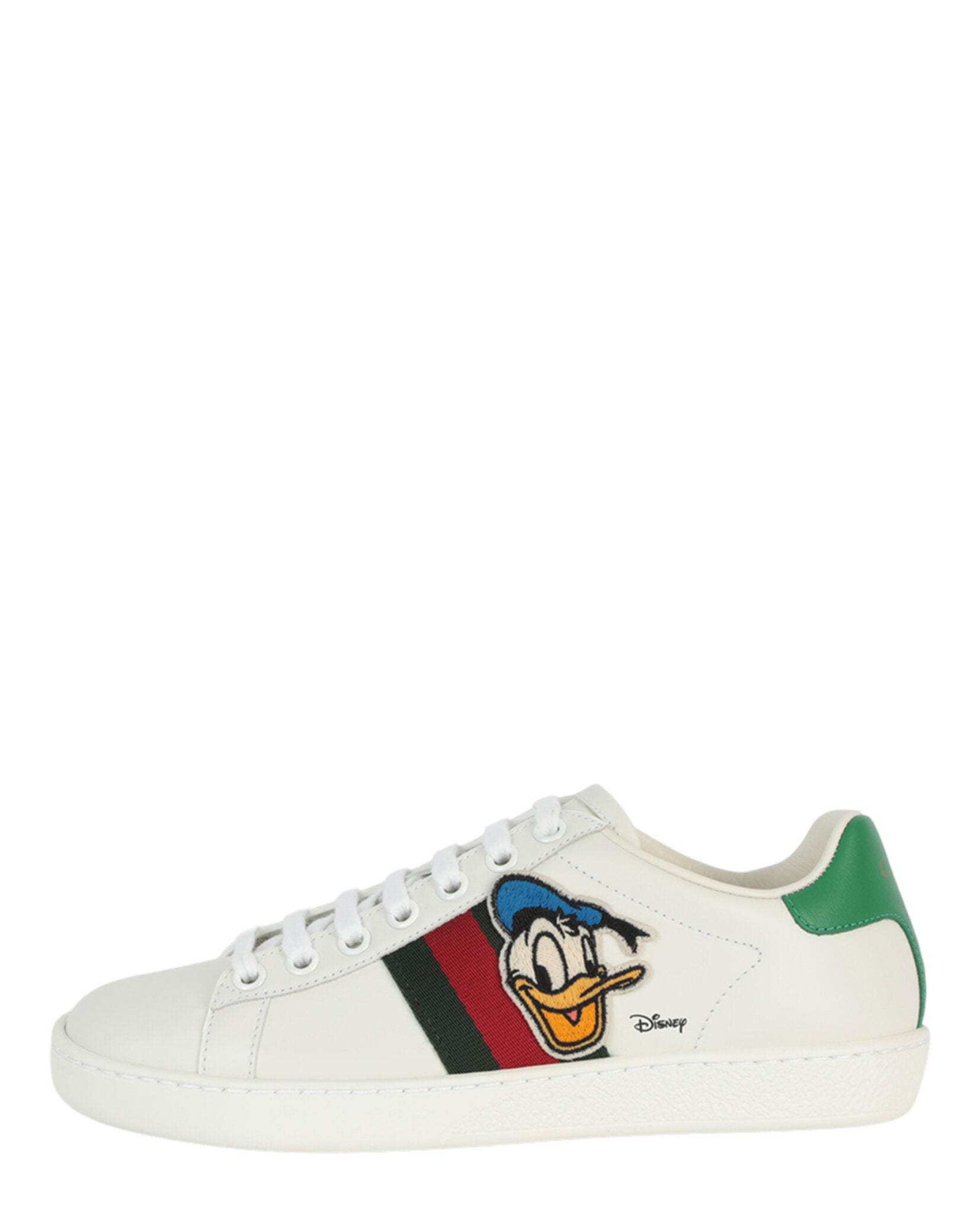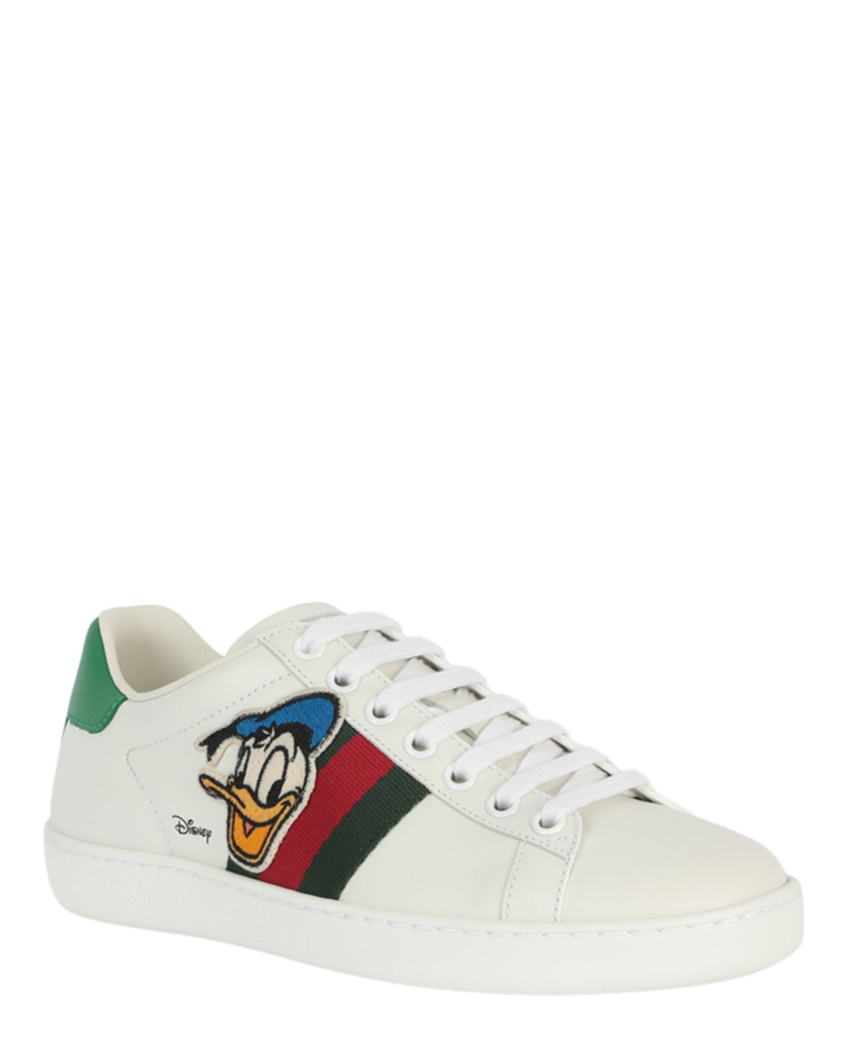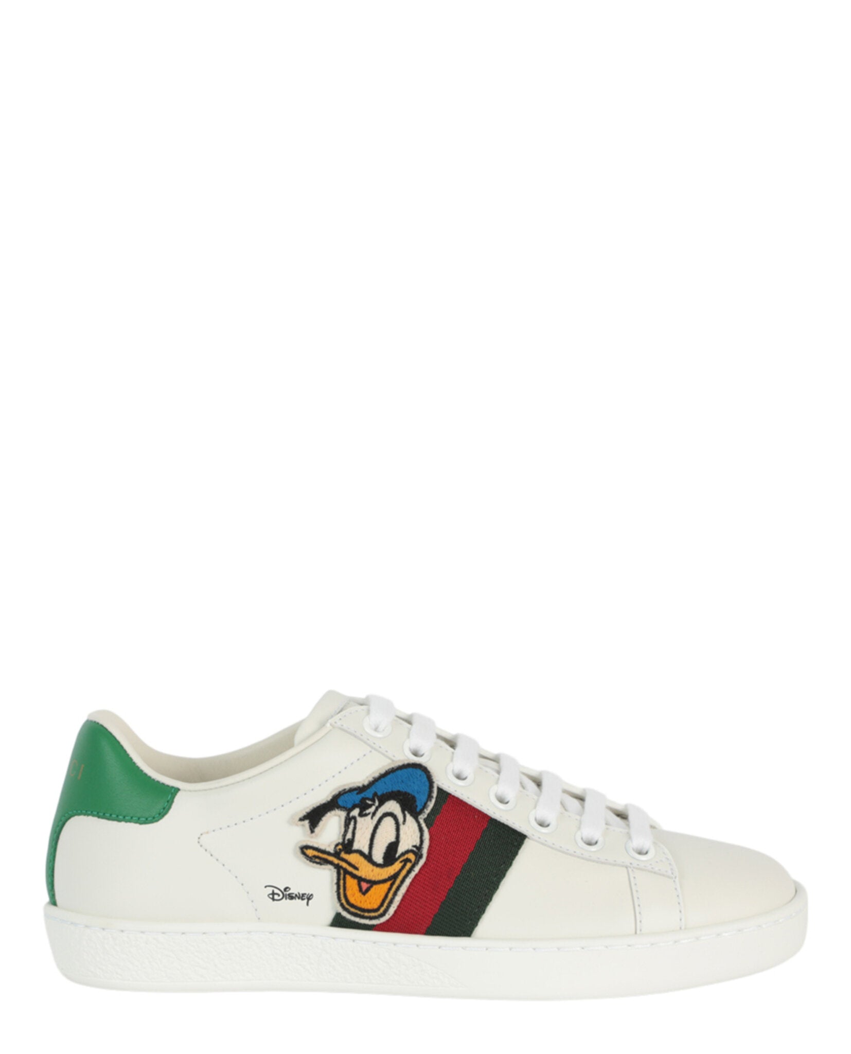 Platform height - 0.875" | Lace up top closure | Round toe | Low-top; Smooth finish | Web accent and Donald Duck patch at the sides | Specialist clean only | Upper - 100% Calfskin leather; Lower - 100% Rubber | Made in ItalyMeasurments -