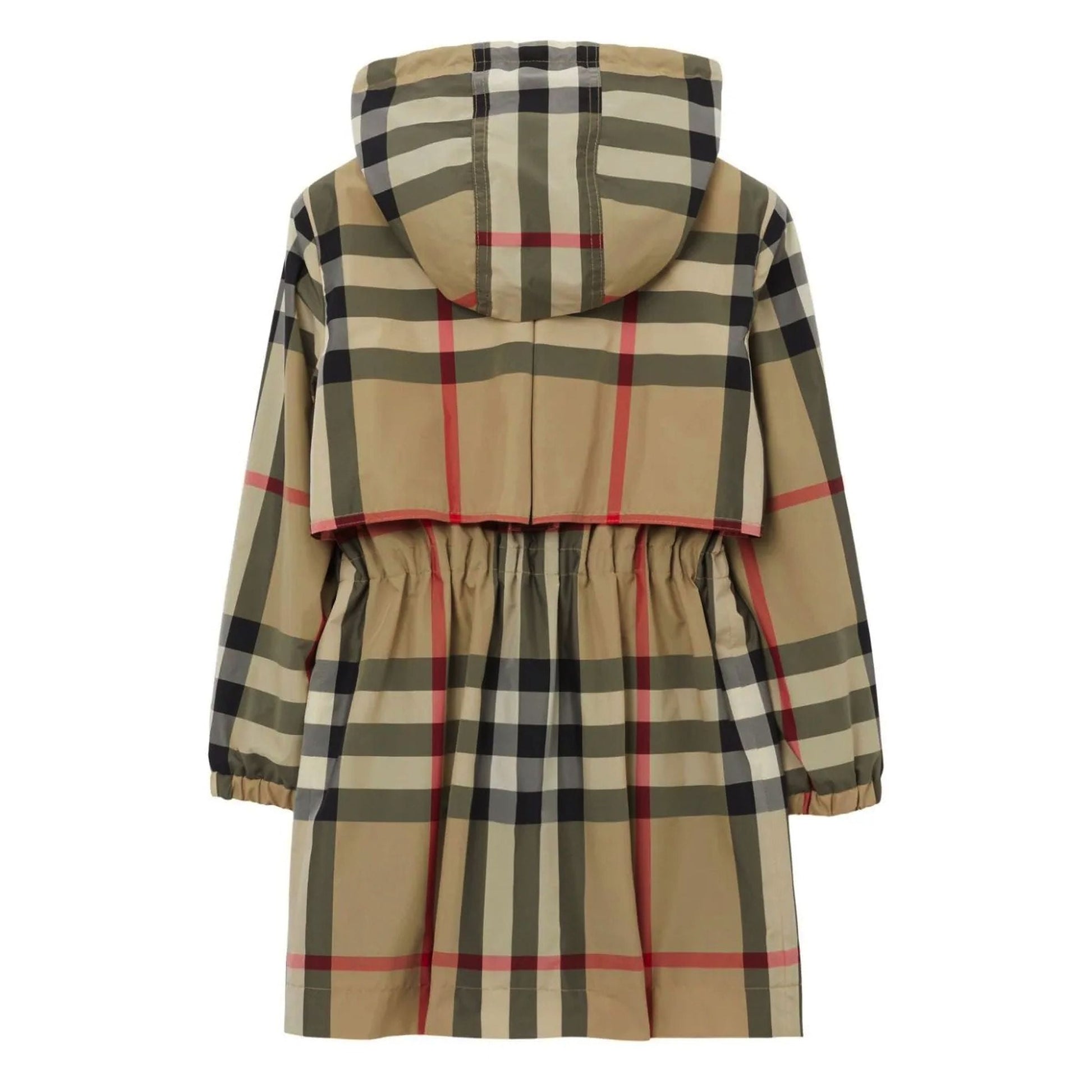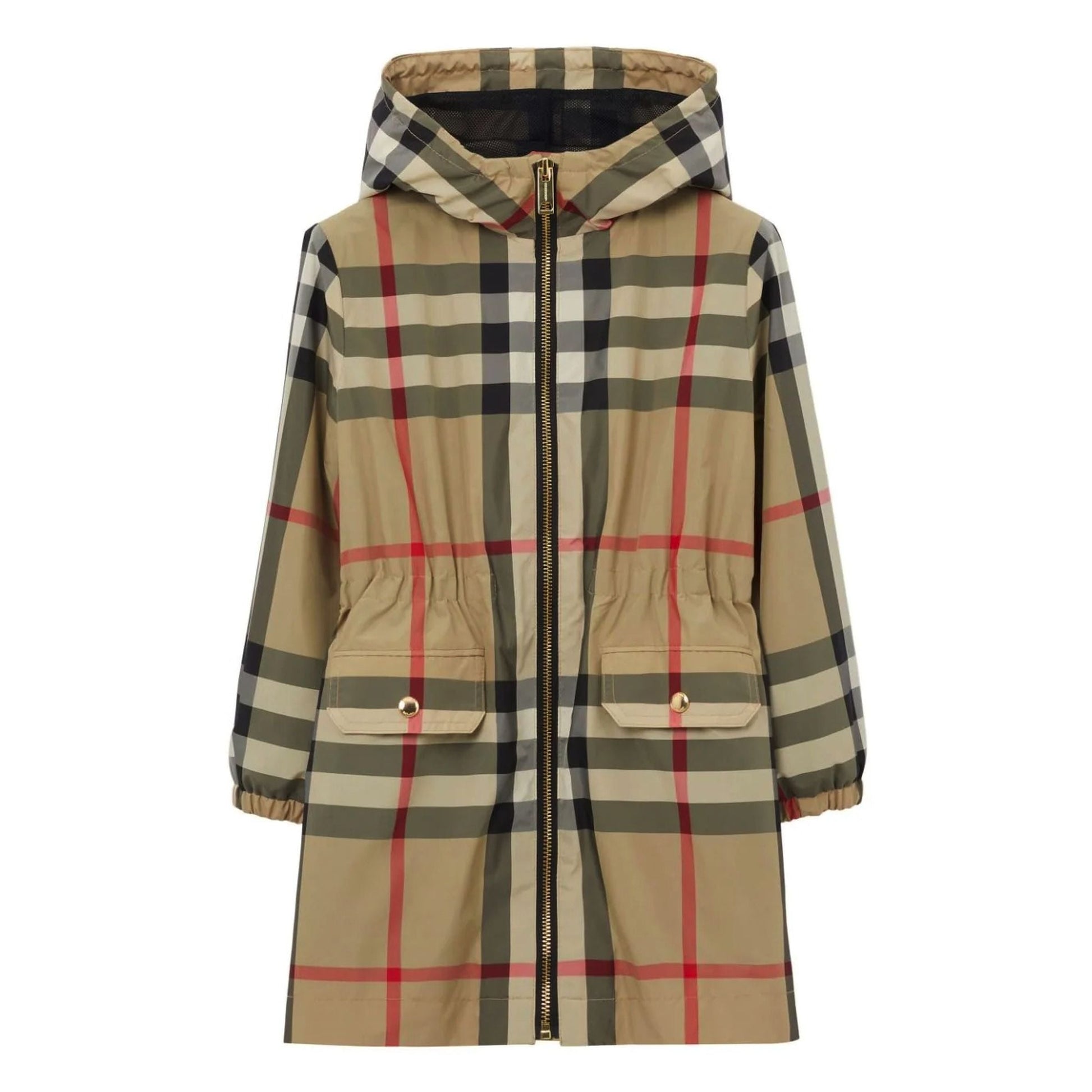 In the brand's signature shade of Archive beige, this hooded coat for girls is designed by luxury British label Burberry. Made from silky smooth fabric, this iconic design is patterned in the brand's oversized check with a gold zip fastening and popper-fastening pockets on the front. Fully lined with light black mesh, this longer-length style has an elasticated waist and cuffs, with a rain shield on the back for a heritage feel.