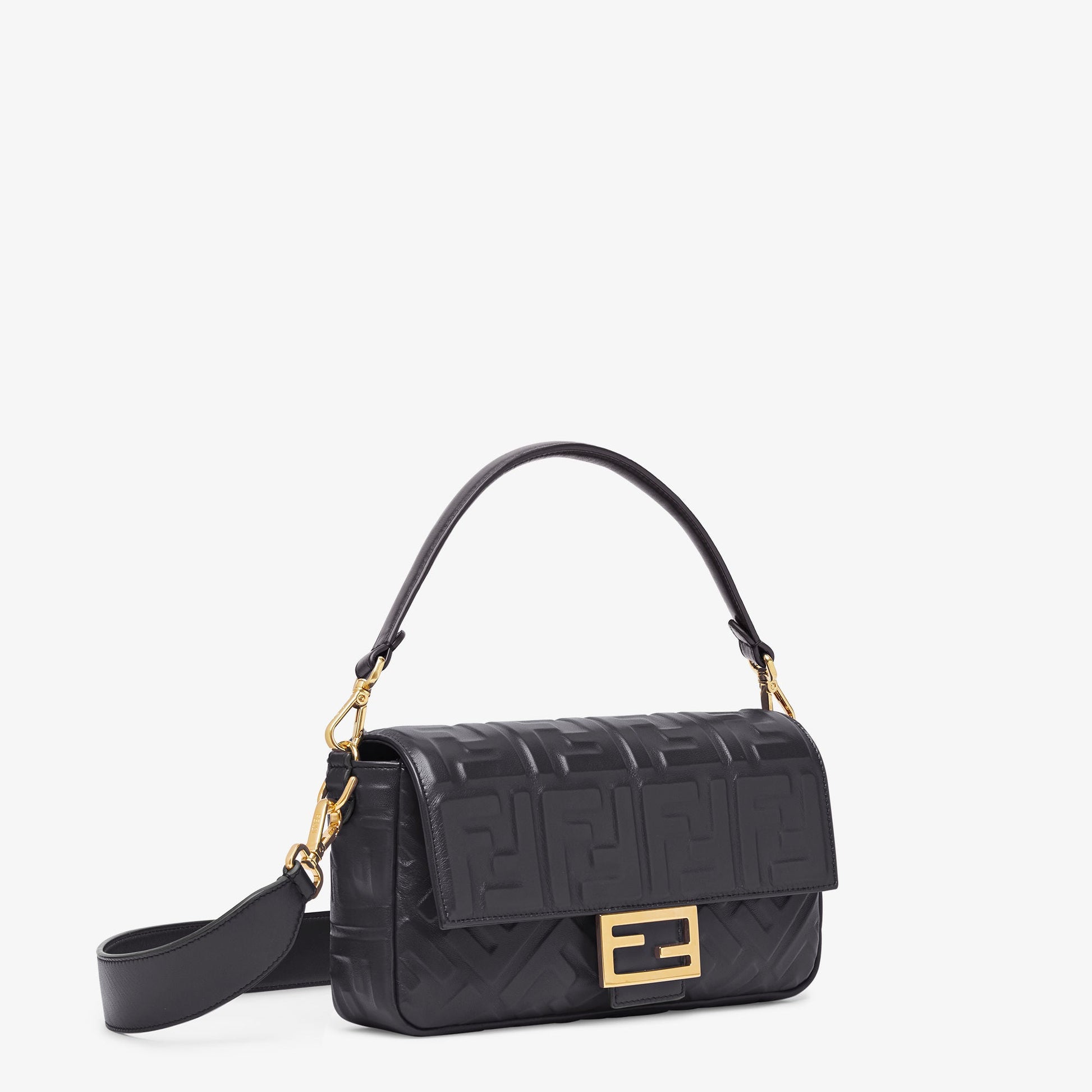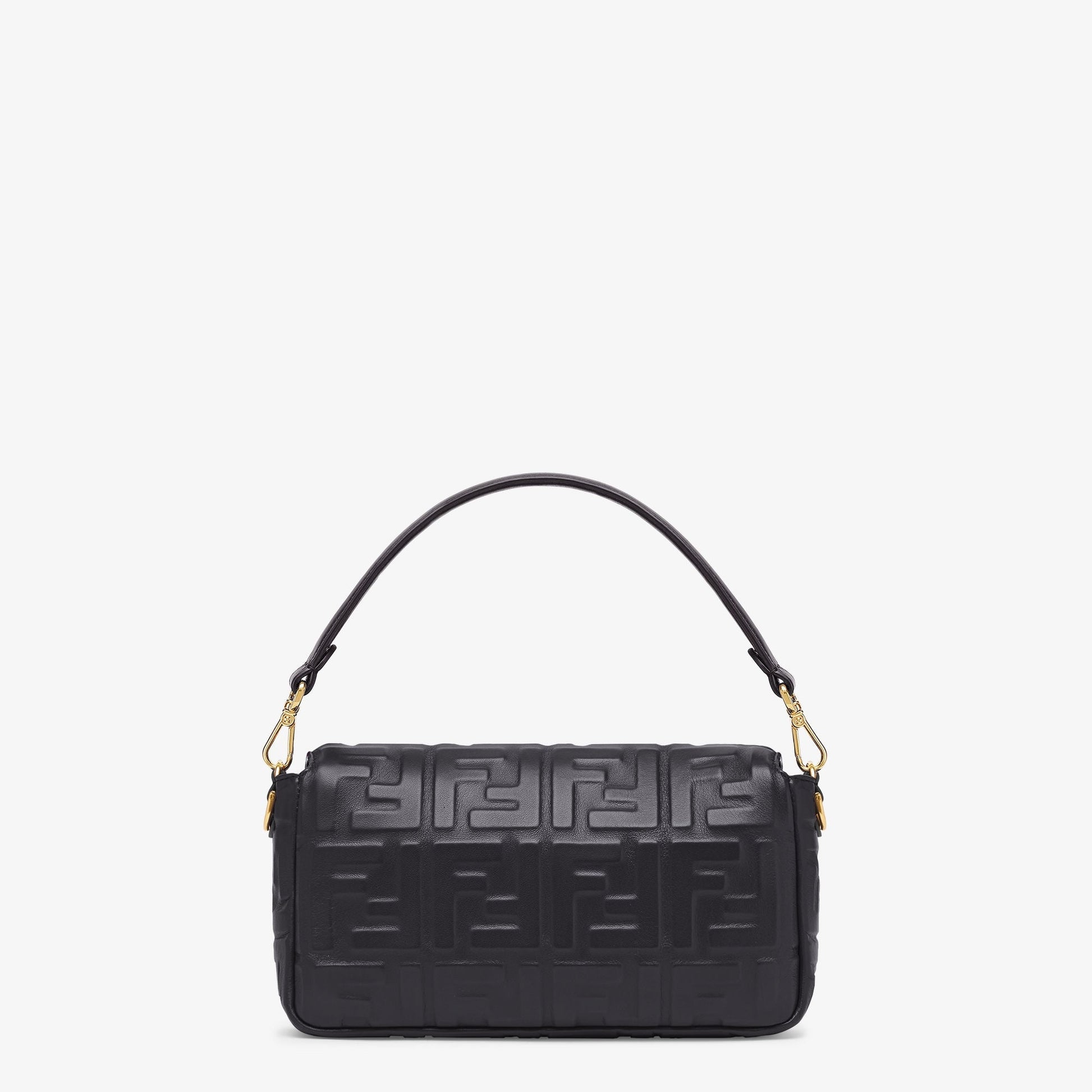 Iconic medium Baguette bag made of black soft nappa leather with a three-dimensional texture FF motif. Decorated with an FF clasp.