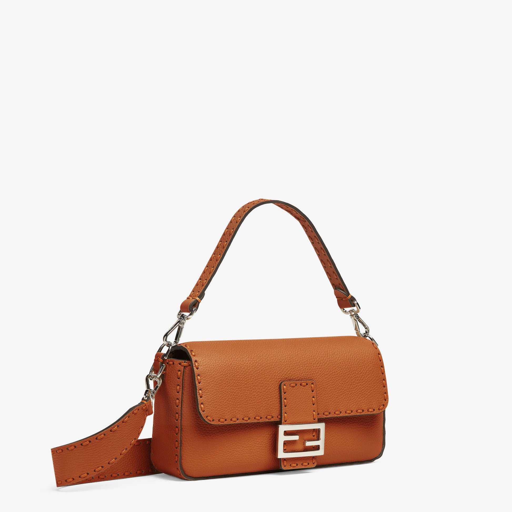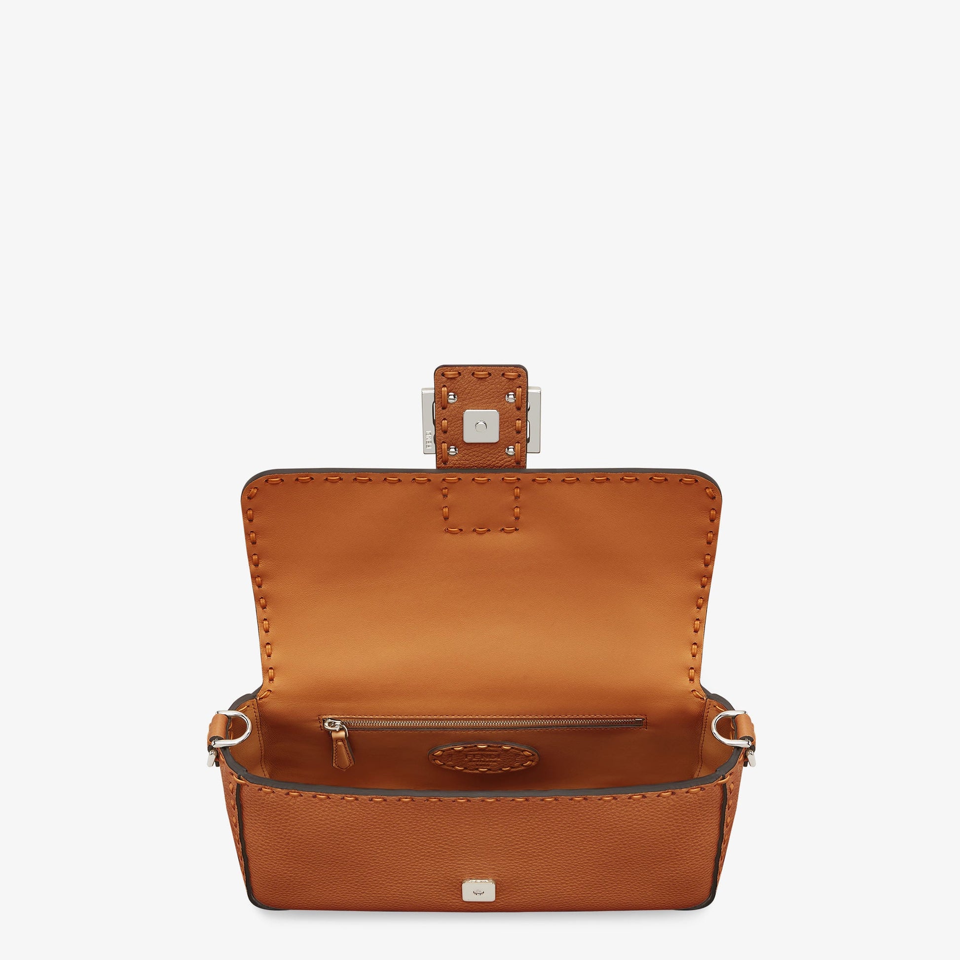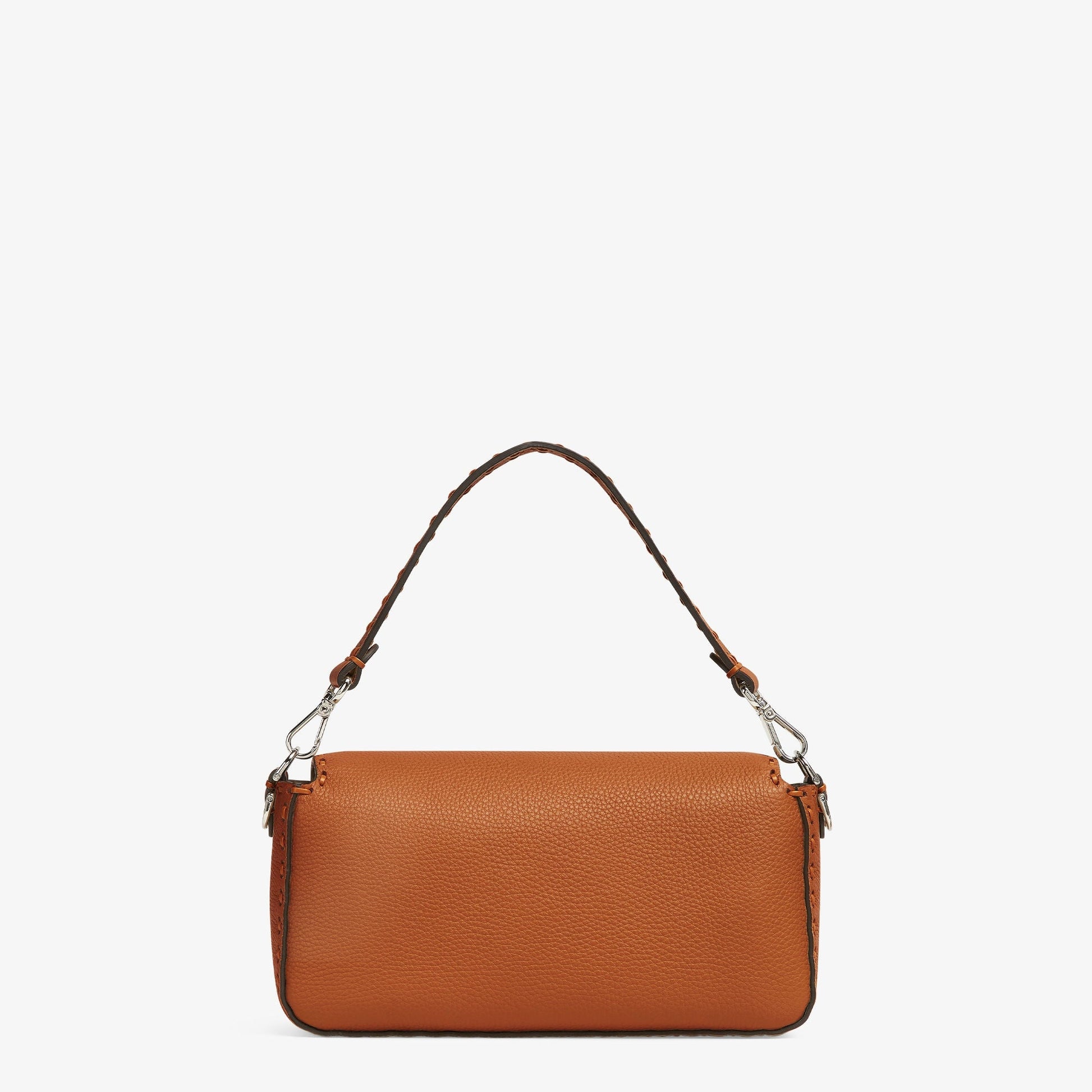 Iconic medium Baguette bag, made of brown Cuoio Romano leather embellished with oversized tone-on-tone hand stitching. Decorated with an FF clasp.