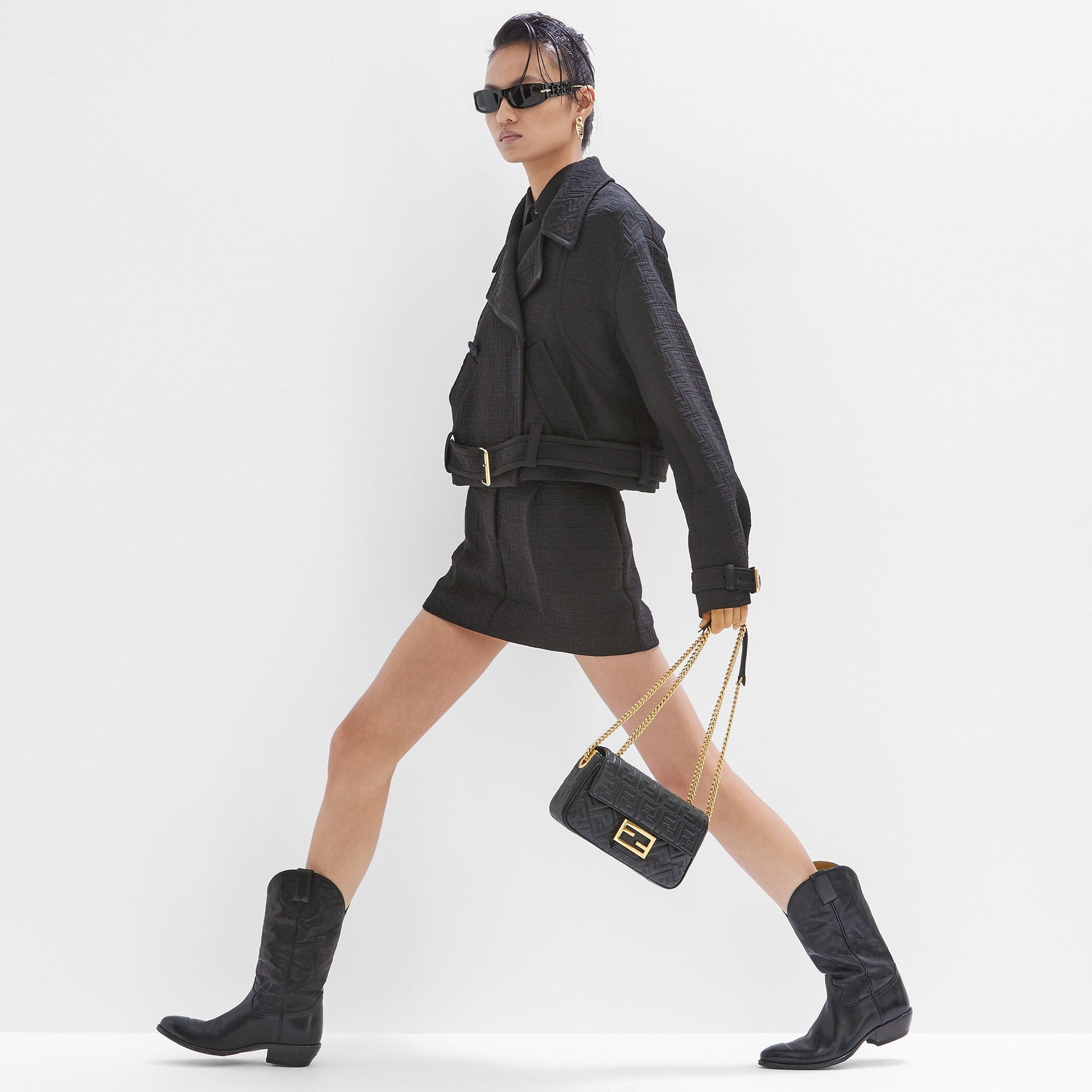 Iconic medium Baguette bag with chain, made of black soft nappa leather with a 3D texture FF motif. Decorated with an FF clasp.