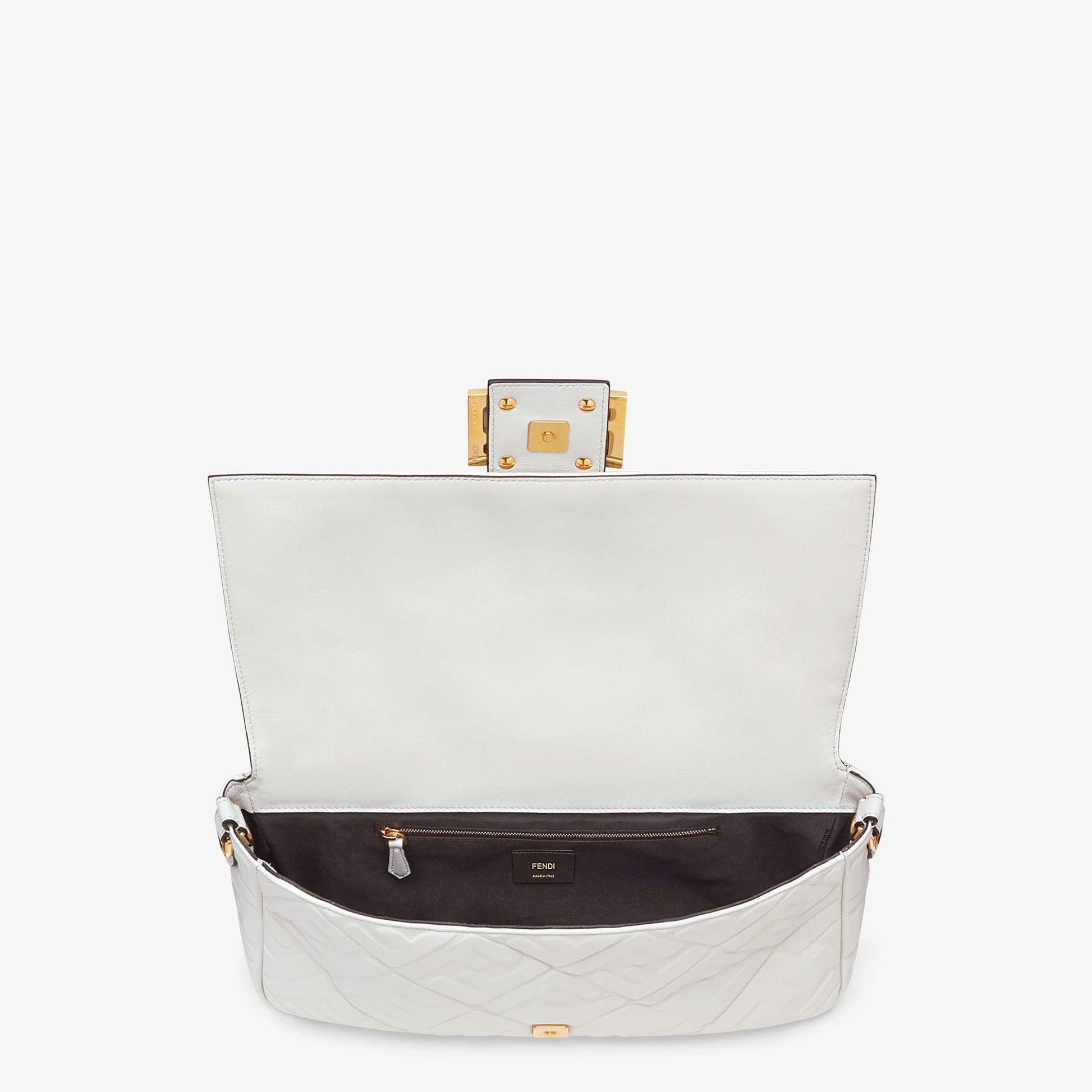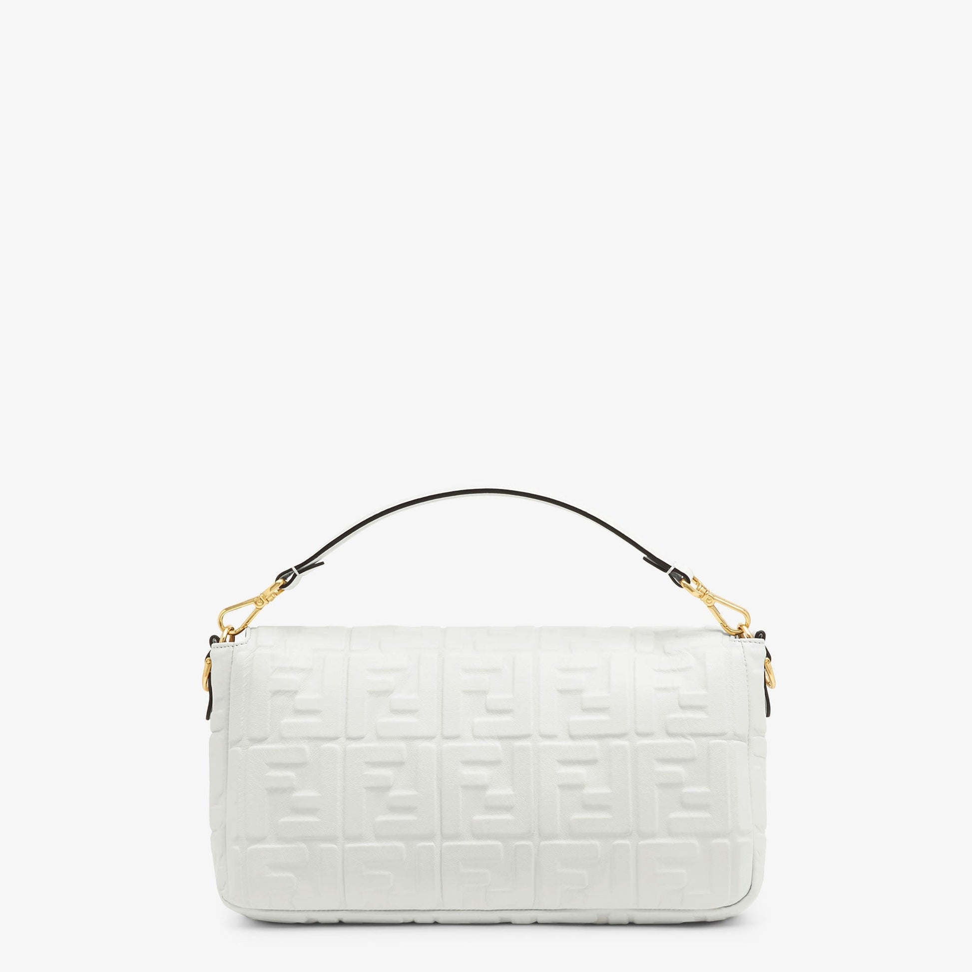 Iconic large Baguette bag made of white soft nappa leather with a three-dimensional texture FF motif. Decorated with an FF clasp.