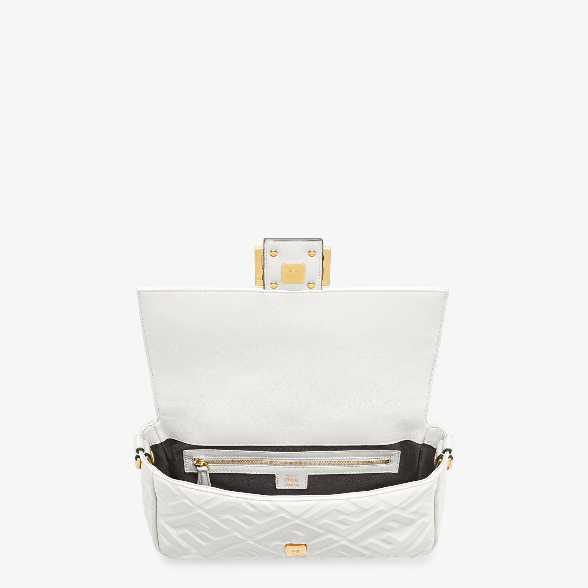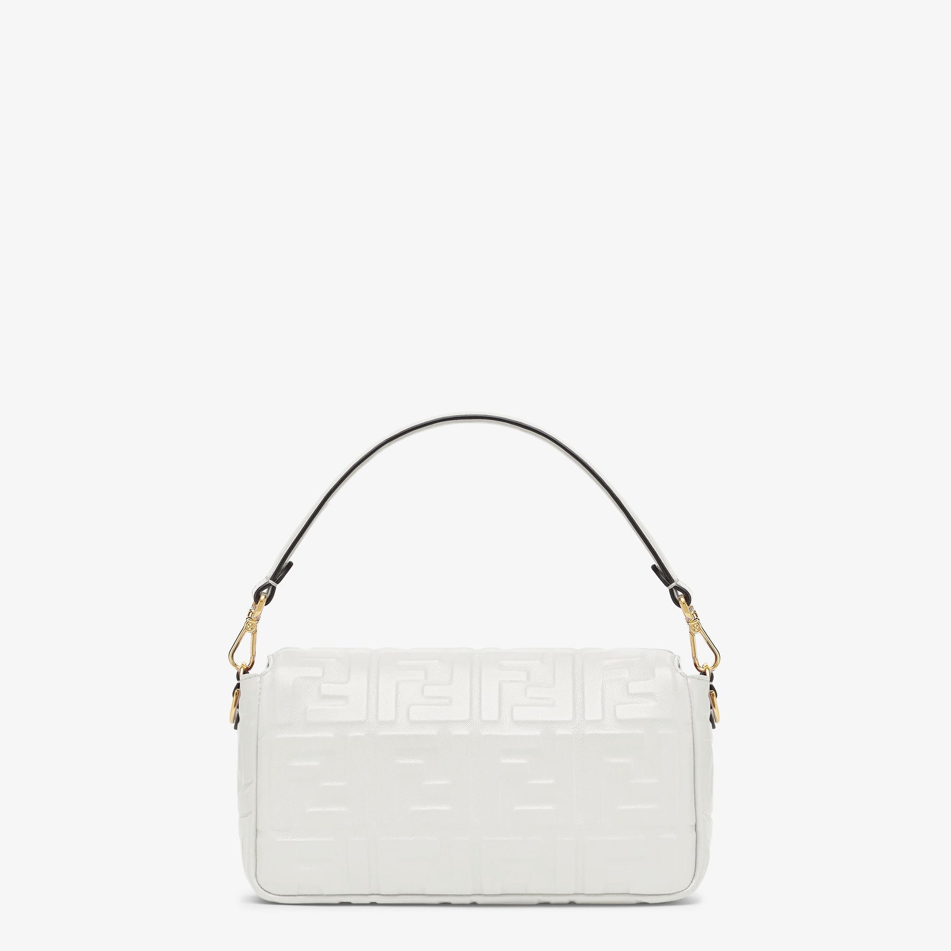 Iconic medium Baguette bag made of white soft nappa leather with a three-dimensional texture FF motif. Decorated with an FF clasp.