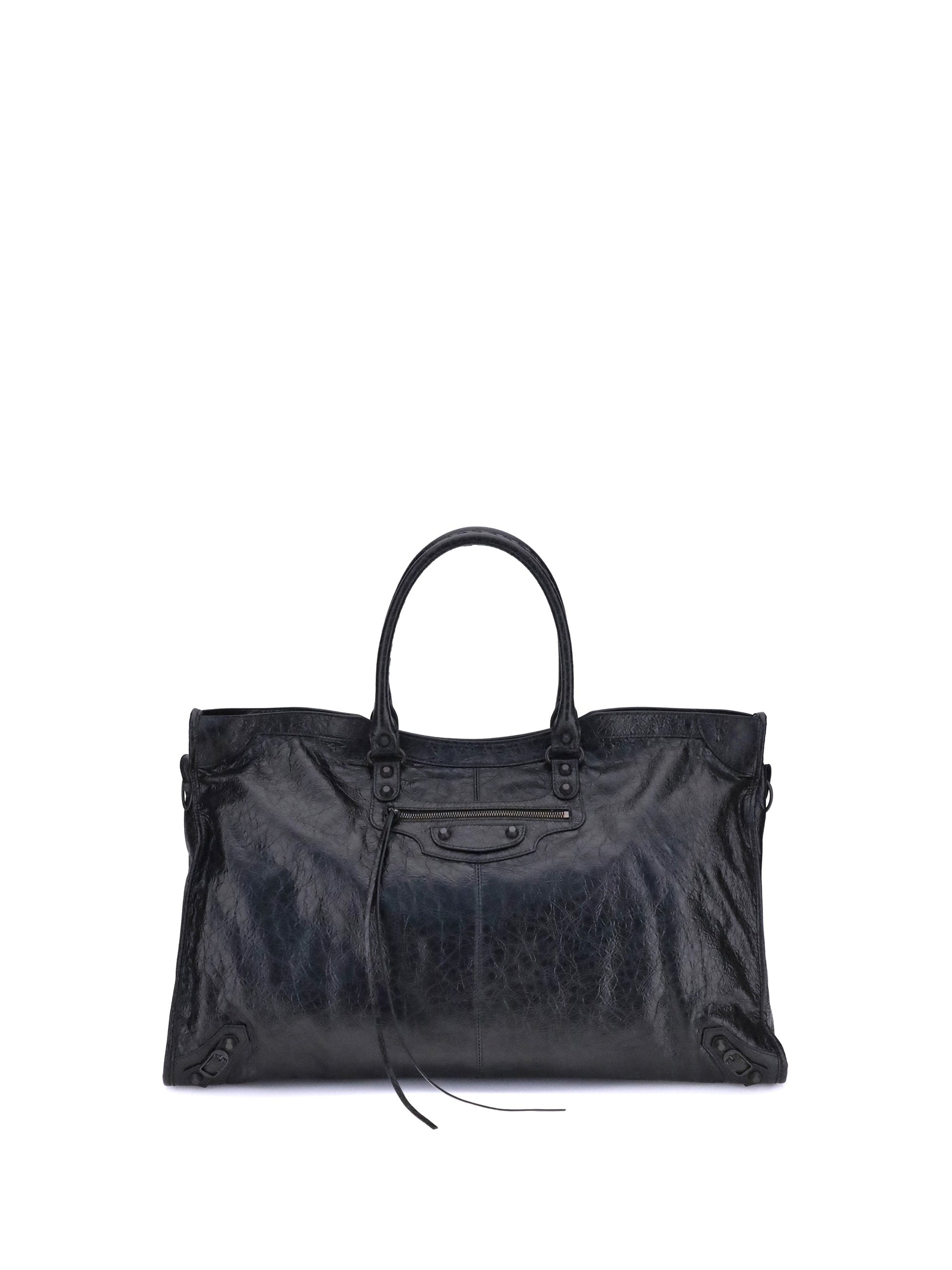 Balenciaga's Le City Travel Bag is a high-class item made of fine lambskin leather that combines elegance and functionality. The two hand-woven leather handles lend a handcrafted and refined touch, while the adjustable and removable shoulder strap allows it to be worn with versatility, either by hand or on the shoulder. The zippered closure and knotted leather zipper pull add distinctive details, while the front zippered pocket offers convenience for quick access to essentials. Inside, a zippered pocket and cotton canvas lining provide organization and durability.
