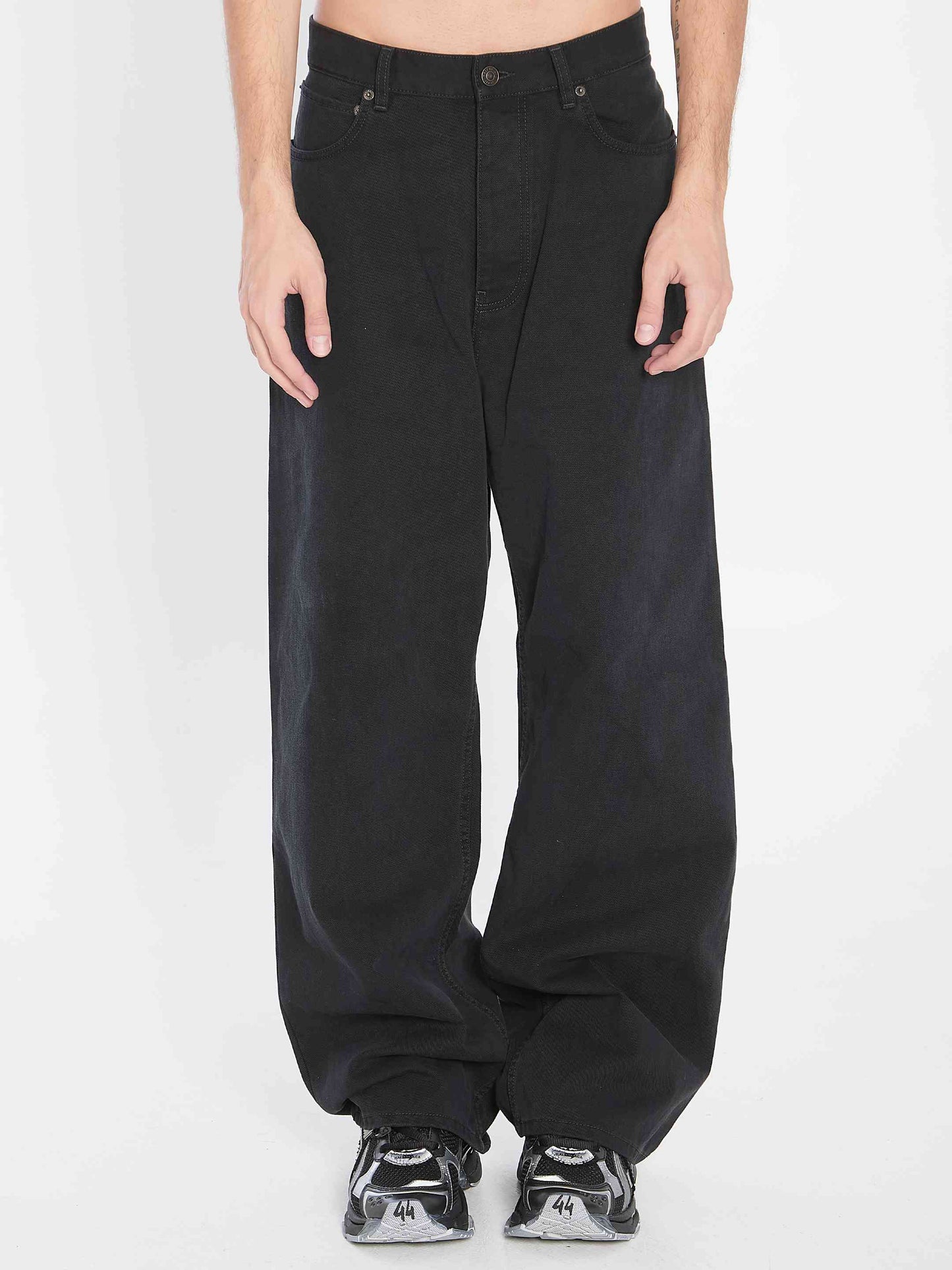 Black denim trousers. Feature a mid-rise waist, concealed zip fly, five belt loops, five pockets, engraved Balenciaga jean buttons, and an inlaid Balenciaga patch on the back. Baggy fit.