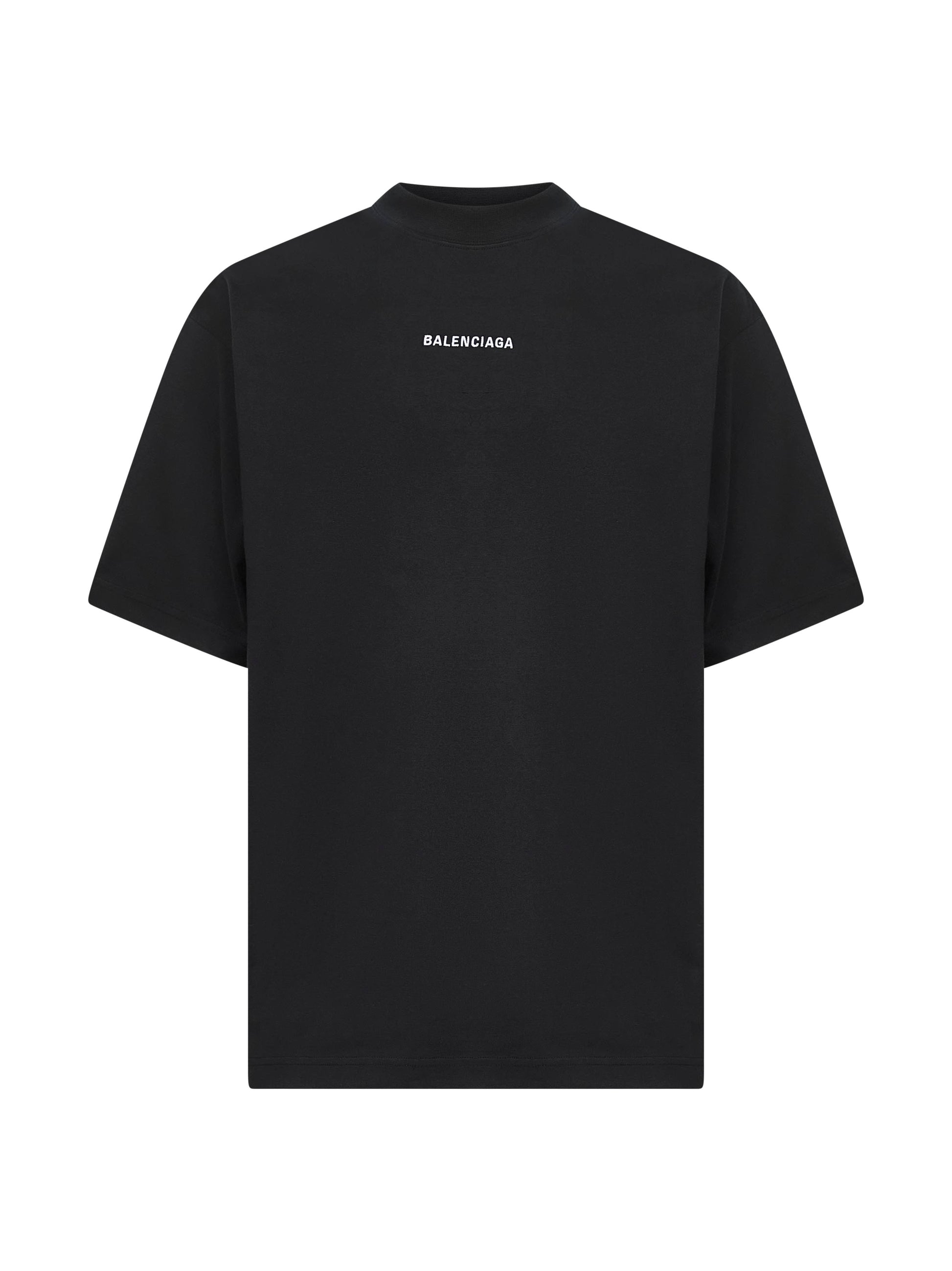 •Ribbed crewneck •Short sleeves, dropped shoulders •White Balenciaga back logo embroidered at front and back •Washed-out effect vintage jersey design •Medium fit •Black color •100% Cotton •Made in Portugal