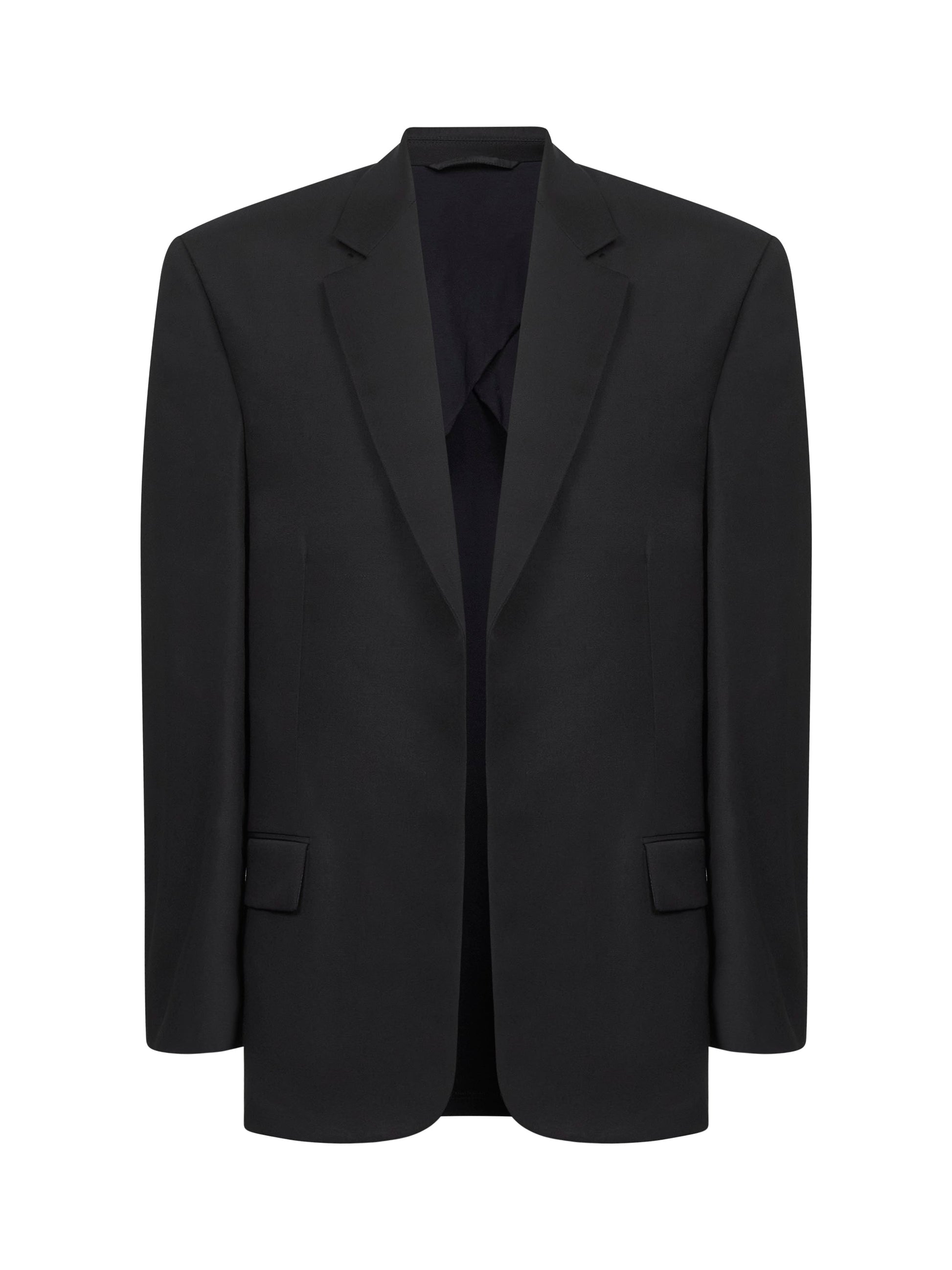 •Single breasted; open front •Classic lapel •Long sleeves, wide shoulders •Welt waist pockets with flap •Partially lined •Loose fit •Black color •100% Wool •Made in Italy