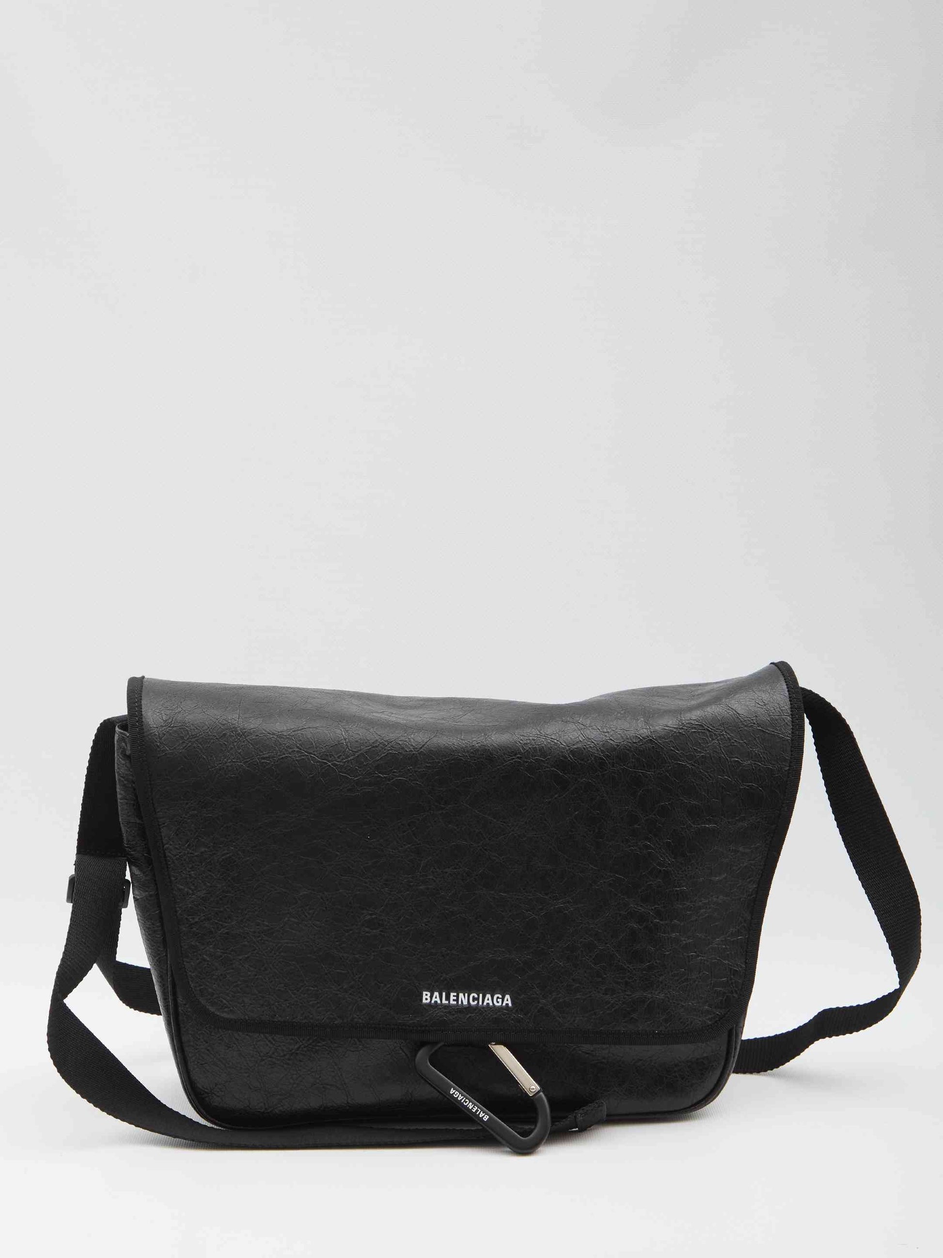 Black grained lambskin leather bag featuring an adjustable fabric shoulder strap, embossed Balenciaga logo on the front, matte black Balenciaga-branded carabiner, Velcro closure, main compartment with internal zip pocket, and fabric trim. Dustbag included. Any leather imperfections are not manufacturing defects but a characteristic of the material.