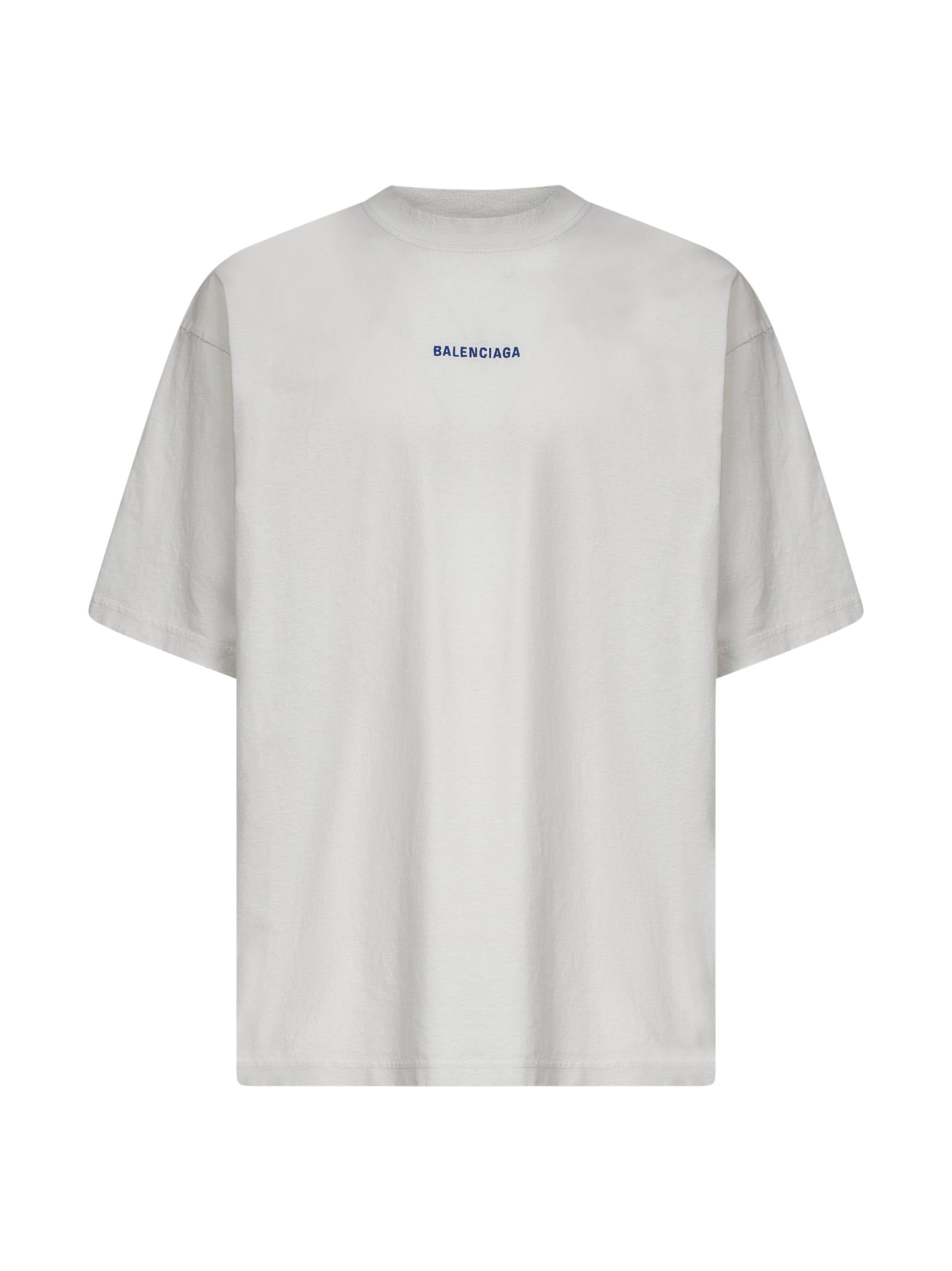 •Ribbed crewneck •Short sleeves, dropped shoulders •Embroidered light blue Balenciaga back logo at front and back •Dry jersey design; worn-out details •Medium fit •Ivory color •100% Cotton •Made in Portugal