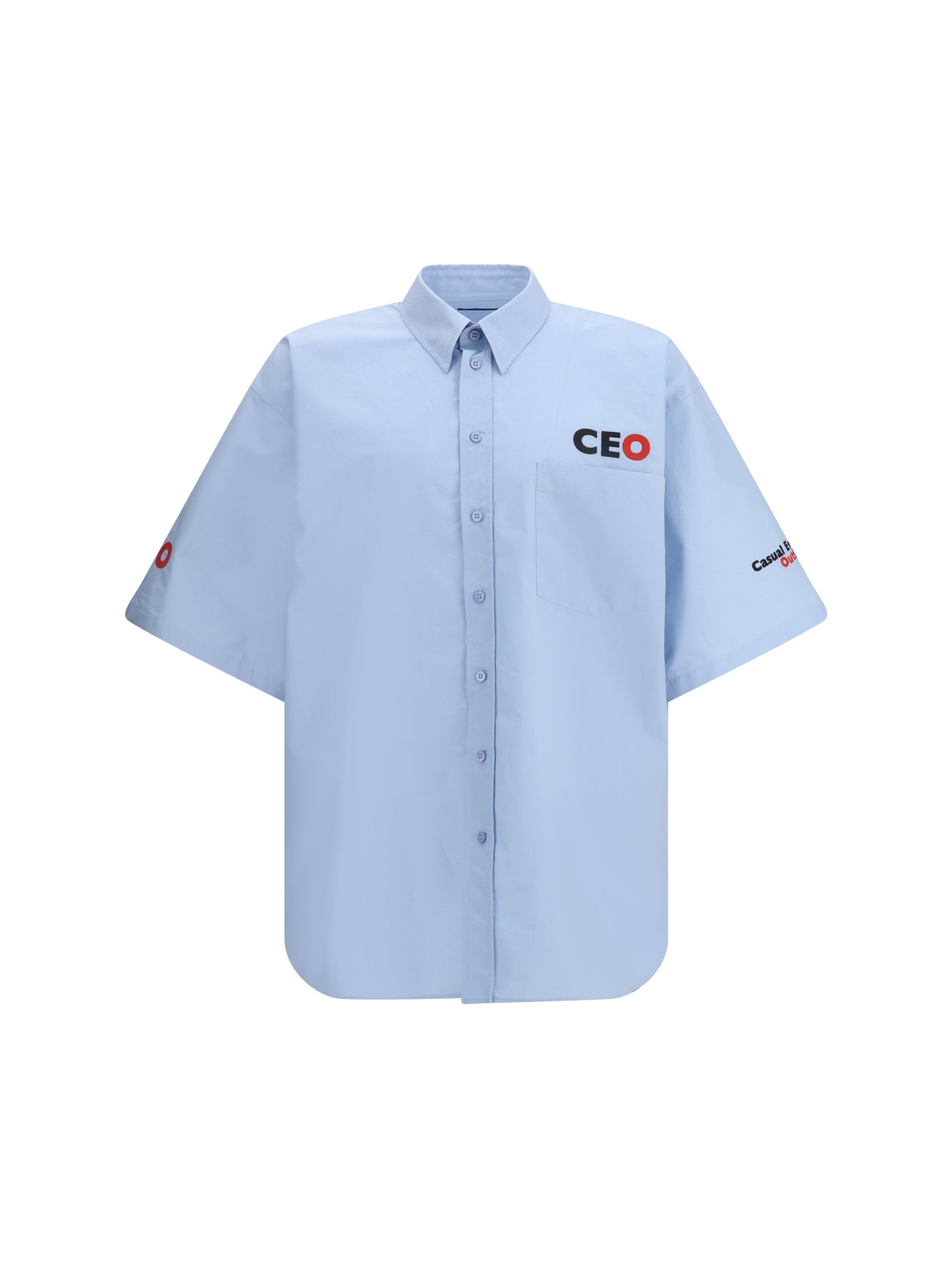 Cotton Shirt by Balenciaga features a classic collar and front button closure. The short-sleeved design features an applique welt pocket on the front, while contrasting embroidered "CEO" lettering on the sleeve and front adds a personal and modern touch. The oversized fit ensures comfort and contemporary style, perfect for a sharp, cutting-edge look.