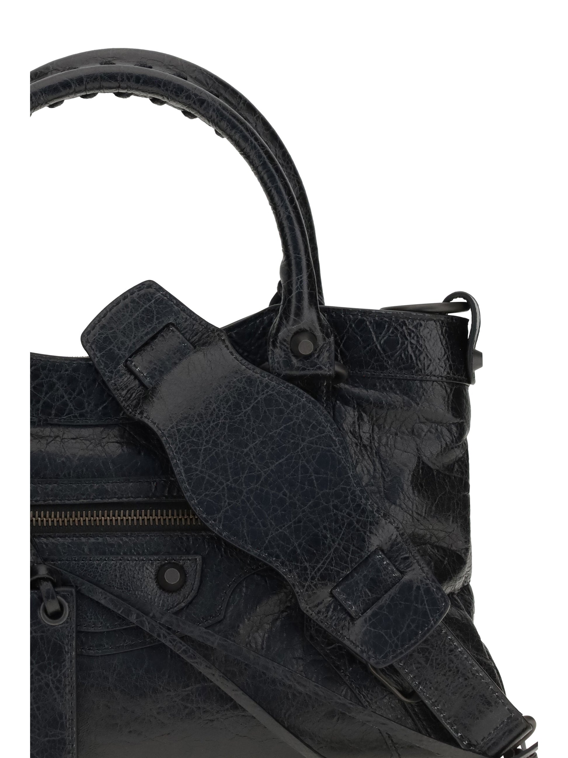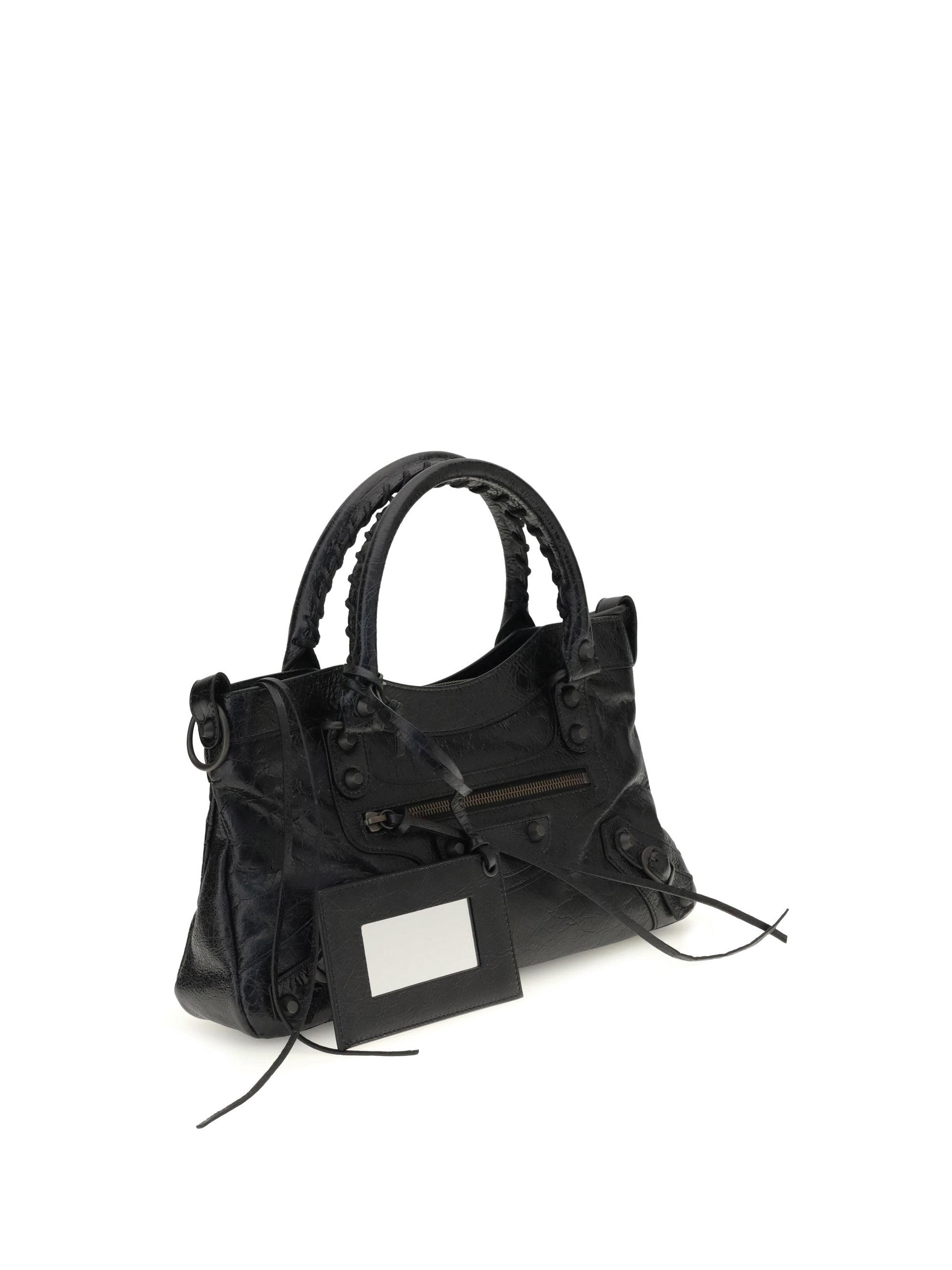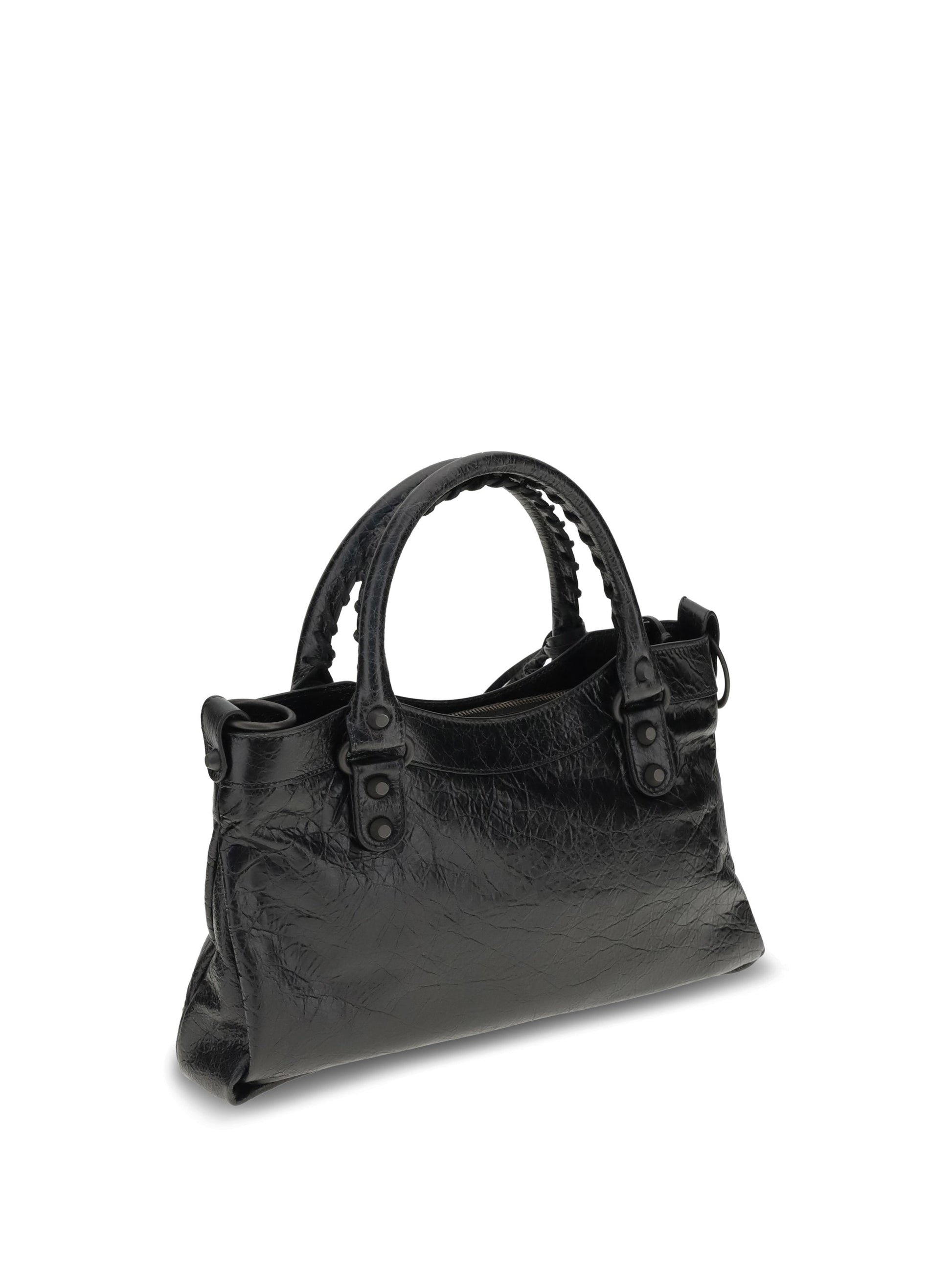 Balenciaga's Le City First Handbag is made of fine Arena Storico lambskin, with two hand-woven handles that enhance its craftsmanship. The adjustable and removable shoulder strap, which features a shoulder reinforcement, allows it to be carried either on the shoulder or by hand. Brass hardware adds a touch of elegance, while the zippered closure is complemented by a knotted leather pull, also echoed in the front zippered pocket. Inside, the main compartment includes a zippered pocket and a removable mirror, on the back of which is the Balenciaga logo embossed blind, a distinctive detail of the model.