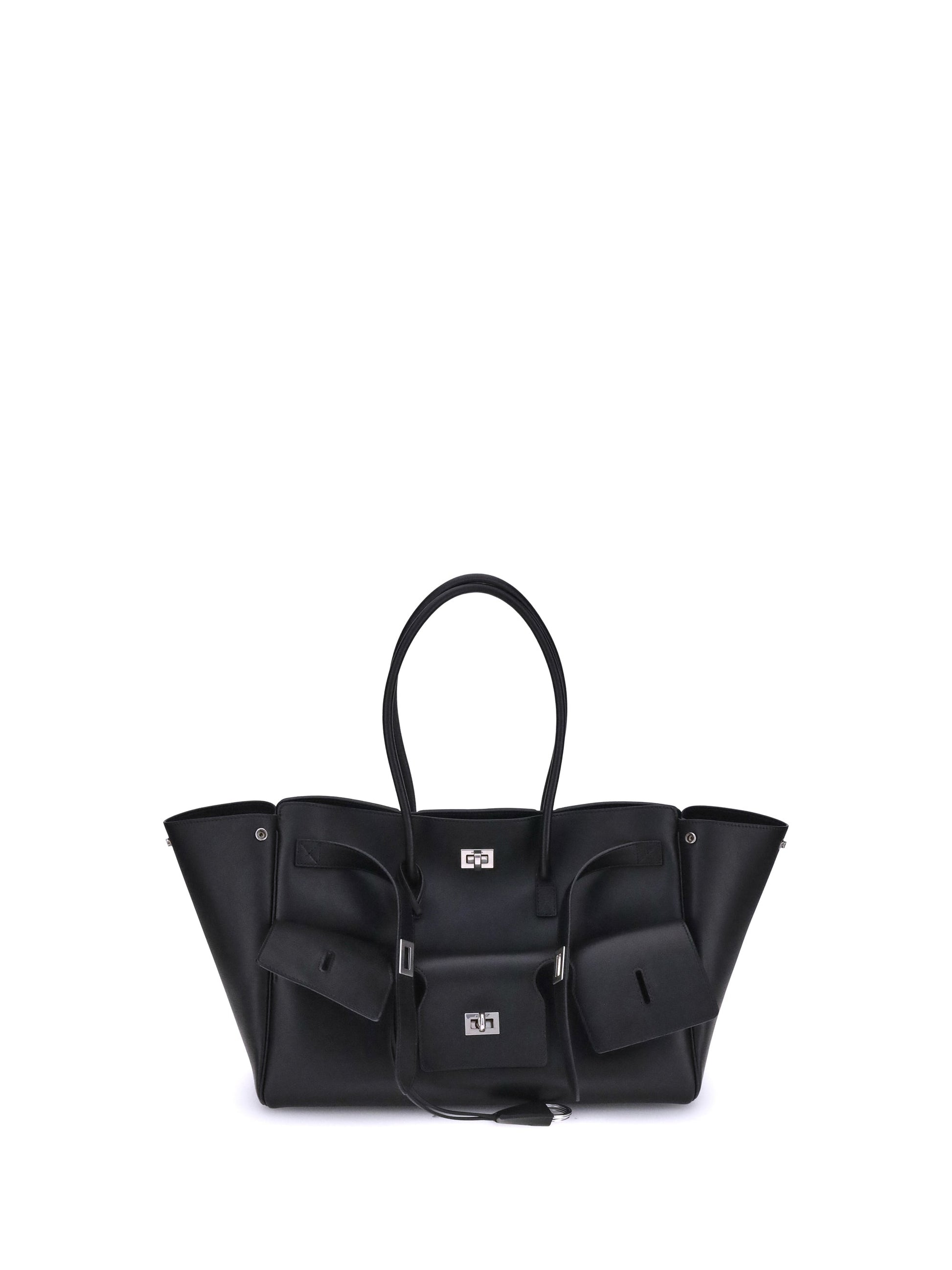 Balenciaga's Bel Air medium Shoulder Bag is a spacious and functional accessory with a versatile pouch design. It features two handles for convenient carrying and the Balenciaga Paris logo embossed with silver lamination on the back, attesting to its . Enhanced with silver hardware and a removable key ring with double spiral loop, this bag is designed for organization: it includes snap buttons on the sides to modulate the shape, a swivel closure, and belts on the front with engraved logo. The interior features a large front pocket, an open main compartment, two interior zippered pockets and two interior flat pockets, offering practical solutions for every need.