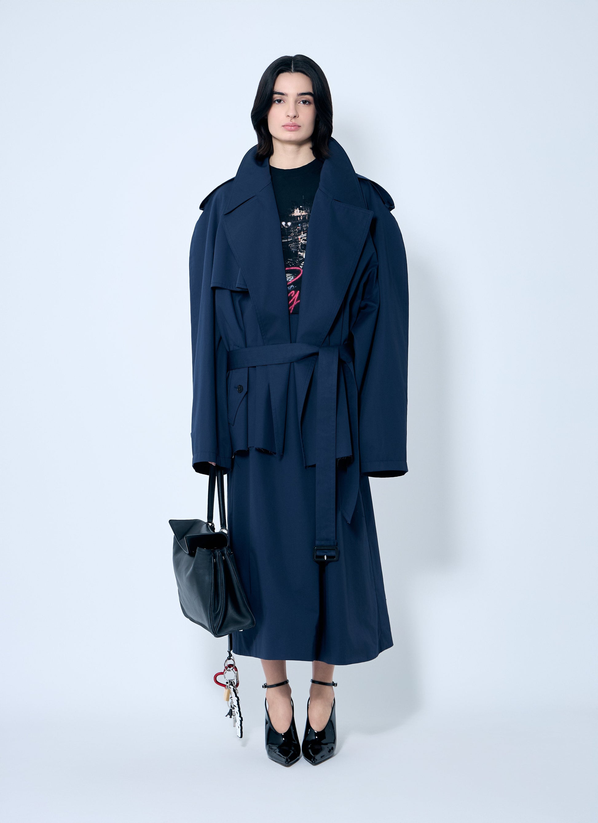 Cropped trench coat with distressed hem.