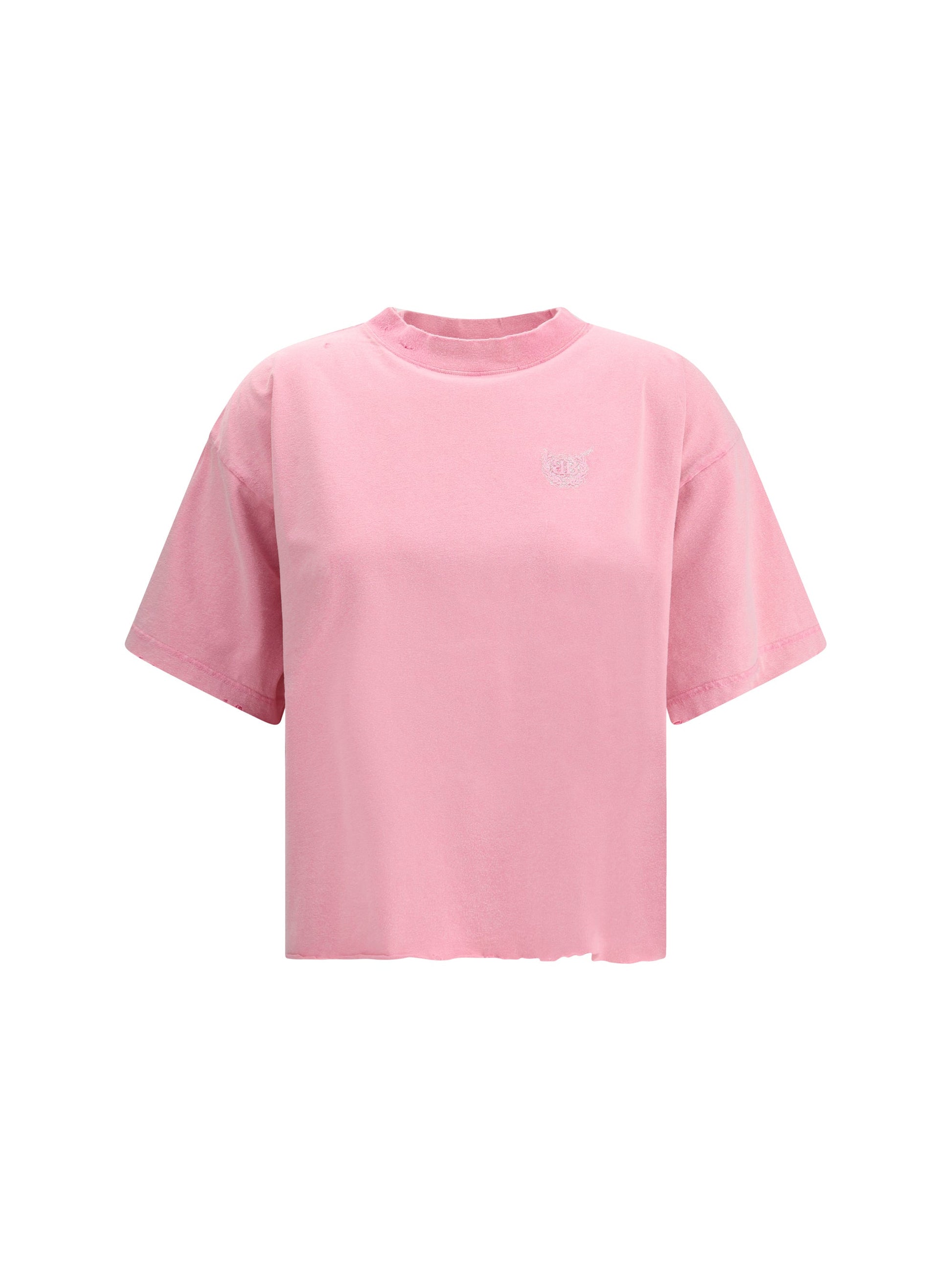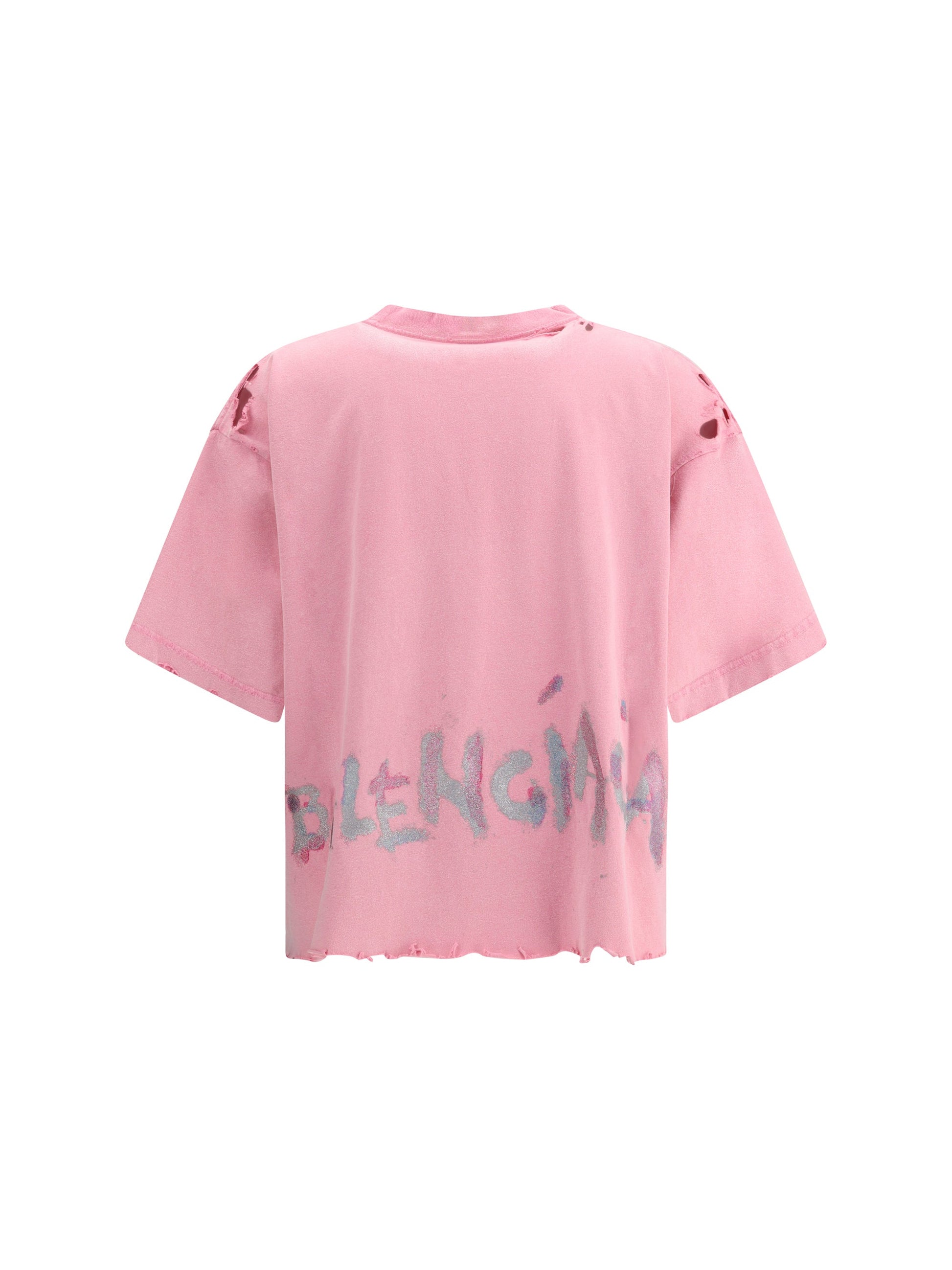 Balenciaga's cotton T-Shirt is a bold, modern piece that combines comfort and contemporary style. The cropped design with ribbed crew neck offers a chic and dynamic fit. The iconic embroidered logo on the front adds a recognizable touch, while the glitter monogram print on the back panel gives a bright and original effect. The destroyed treatment gives the T-shirt a worn-in look, adding a distinctive, urban character to the look.