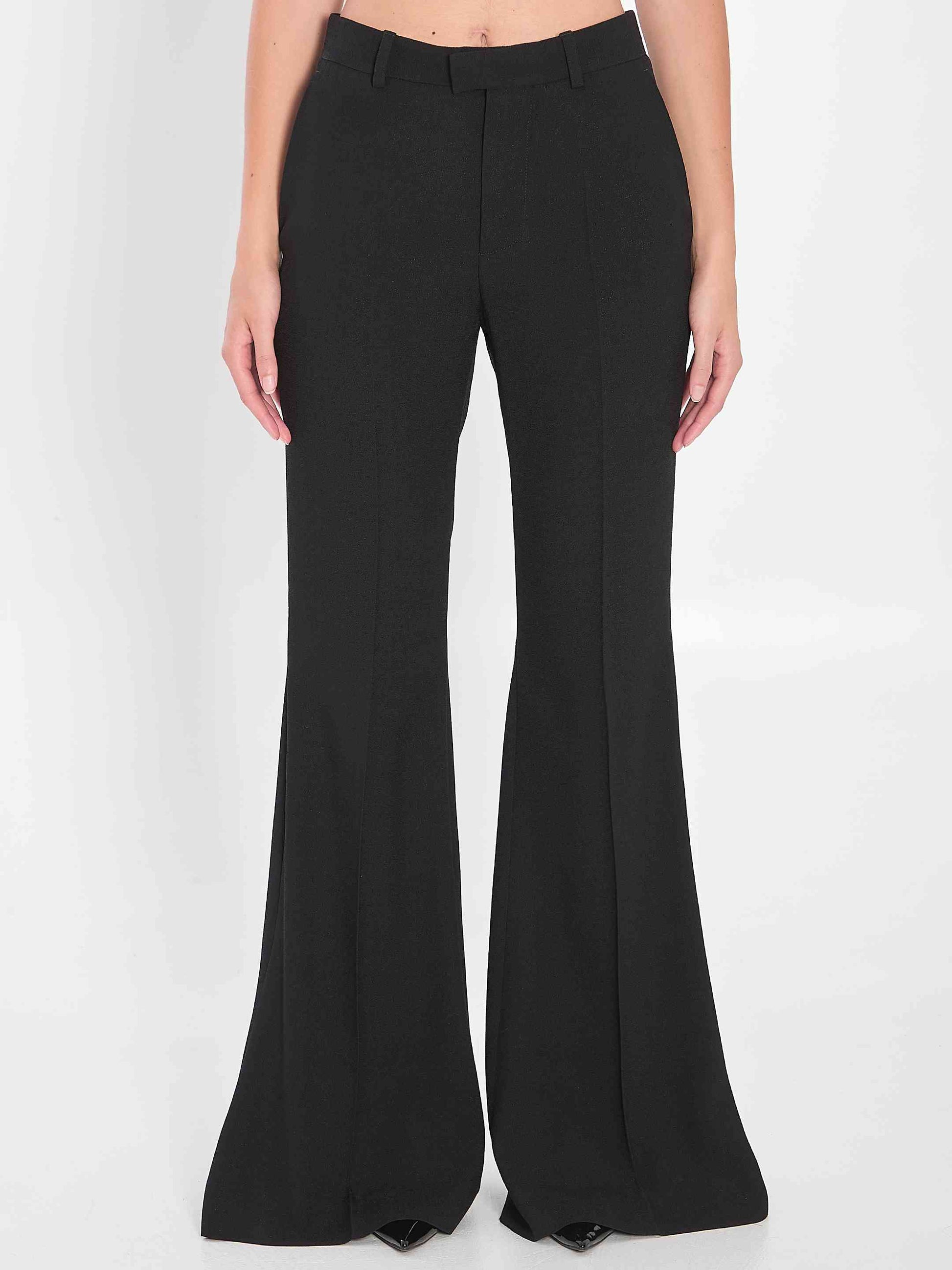 Flared trousers in black viscose. Featuring a mid-rise waist, concealed zip fly, and two front slash pockets.