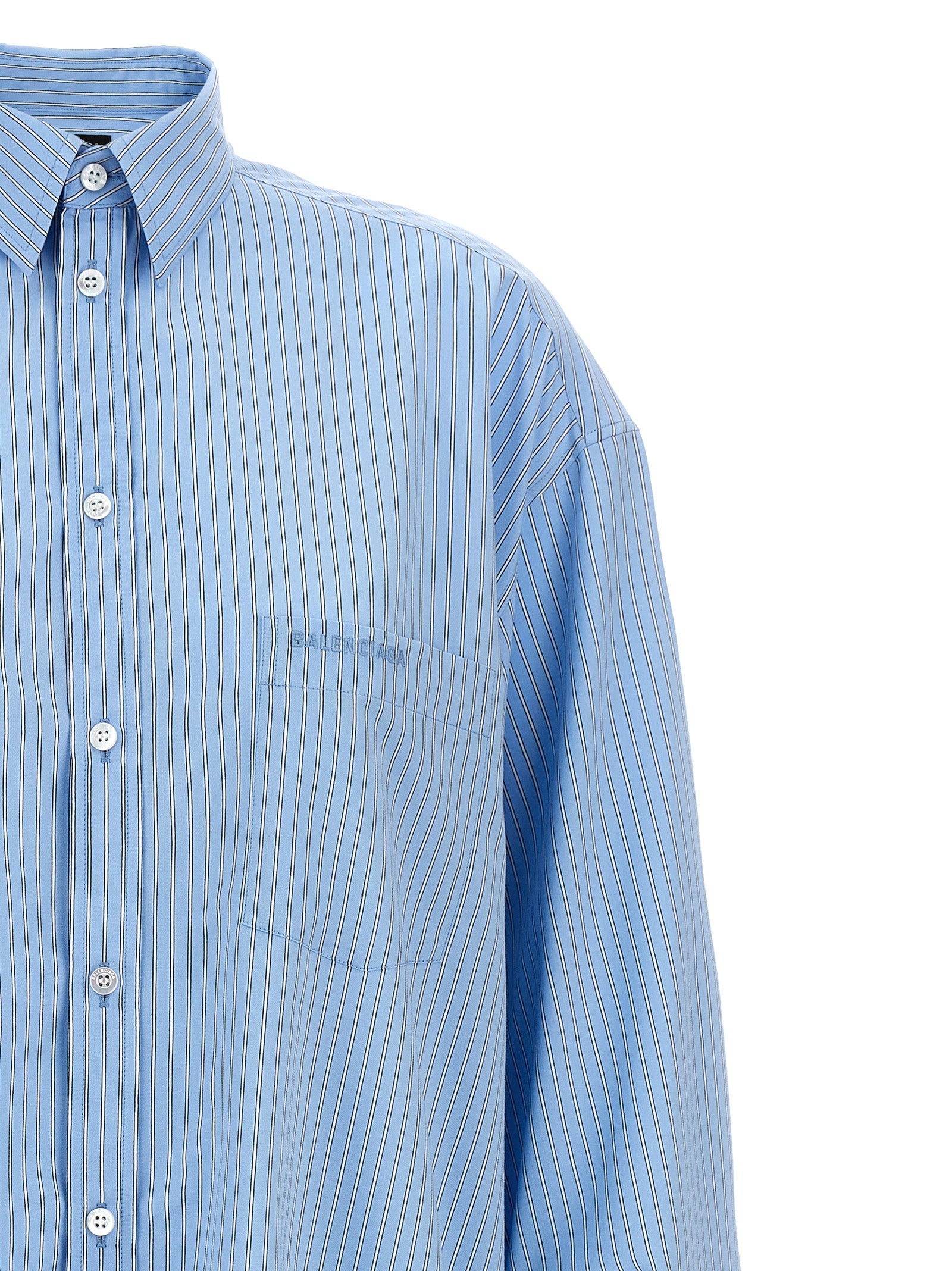 Striped technical viscose blouse, pocket with tone-on-tone embroidered logo, front button closure, long sleeves with knotted cuffs and dropped shoulders.
